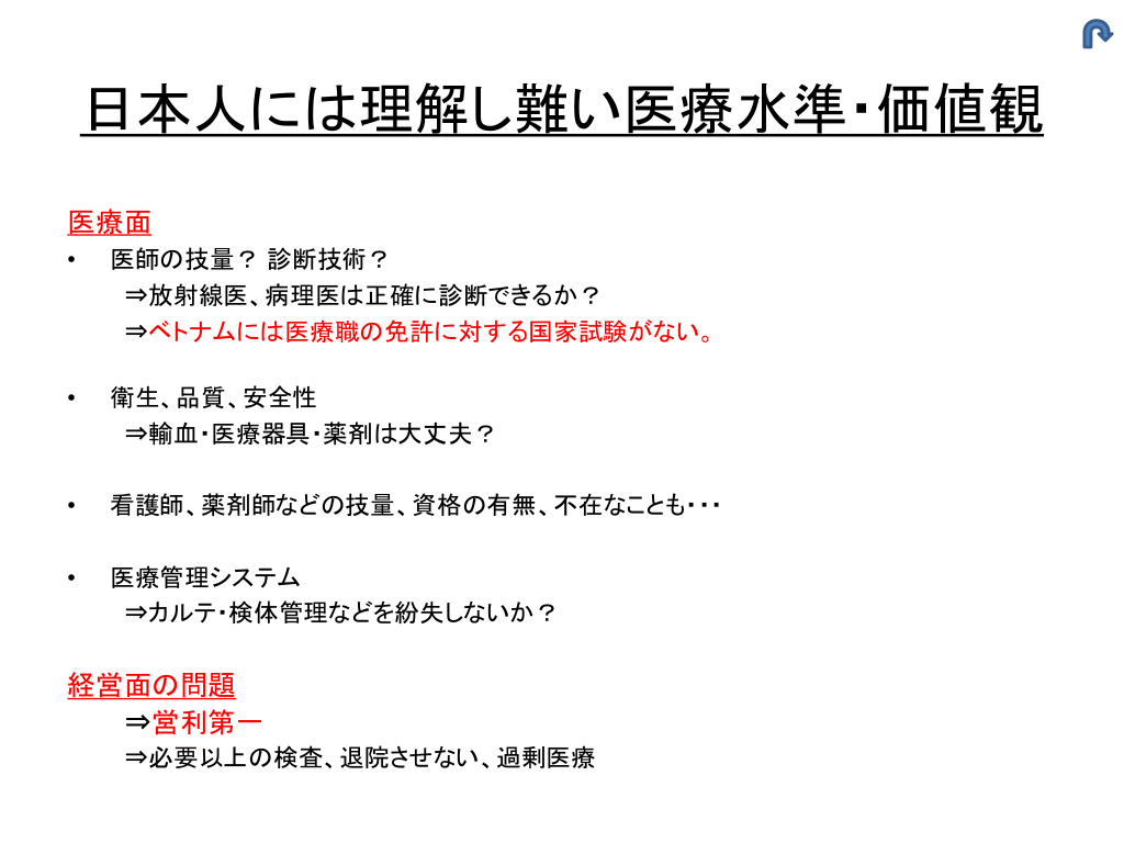 #88. 日本人には理解し難い医療水準・価値観 医療面 • 医師の技量? 診断技術? ⇒放射線医、病理医は正確に診断できるか? ⇒ベトナムには医療職の免許に対する国家試験がない。 • 衛生、品質、安全性 ⇒輸血・医療器具・薬剤は大丈夫? • 看護師、薬剤師などの技量、資格の有無、不在なことも・・・ • 医療管理システム ⇒カルテ・検体管理などを紛失しないか? 経営面の問題 ⇒営利第一 ⇒必要以上の検査、退院させない、過剰医療