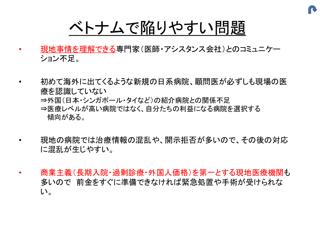 #90. ベトナムで陥りやすい問題 • 現地事情を理解できる専門家(医師・アシスタンス会社)とのコミュニケー ション不足。 • 初めて海外に出てくるような新規の日系病院、顧問医が必ずしも現場の医 療を認識していない ⇒外国(日本・シンガポール・タイなど)の紹介病院との関係不足 ⇒医療レベルが高い病院ではなく、自分たちの利益になる病院を選択する 傾向がある。 • 現地の病院では治療情報の混乱や、開示拒否が多いので、その後の対応 に混乱が生じやすい。 • 商業主義(長期入院・過剰診療・外国人価格)を第一とする現地医療機関も 多いので 前金をすぐに準備できなければ緊急処置や手術が受けられな い。