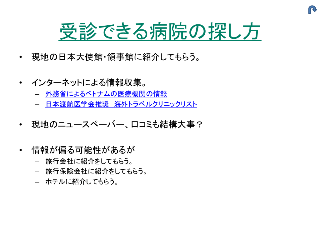 #91. 受診できる病院の探し方 • 現地の日本大使館・領事館に紹介してもらう。 • インターネットによる情報収集。 – 外務省によるベトナムの医療機関の情報 – 日本渡航医学会推奨 海外トラベルクリニックリスト • 現地のニュースペーパー、口コミも結構大事? • 情報が偏る可能性があるが – 旅行会社に紹介をしてもらう。 – 旅行保険会社に紹介をしてもらう。 – ホテルに紹介してもらう。