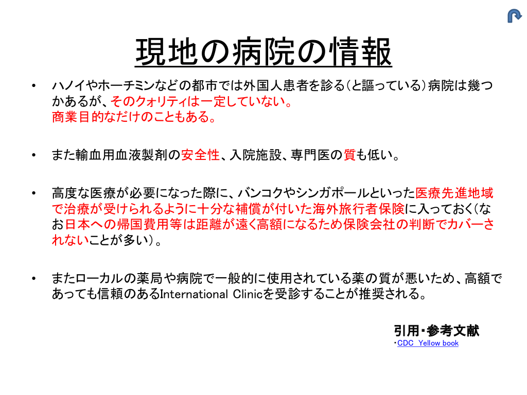 #92. 現地の病院の情報 • ハノイやホーチミンなどの都市では外国人患者を診る(と謳っている)病院は幾つ かあるが、そのクォリティは一定していない。 商業目的なだけのこともある。 • また輸血用血液製剤の安全性、入院施設、専門医の質も低い。 • 高度な医療が必要になった際に、バンコクやシンガポールといった医療先進地域 で治療が受けられるように十分な補償が付いた海外旅行者保険に入っておく(な お日本への帰国費用等は距離が遠く高額になるため保険会社の判断でカバーさ れないことが多い)。 • またローカルの薬局や病院で一般的に使用されている薬の質が悪いため、高額で あっても信頼のあるInternational Clinicを受診することが推奨される。 引用・参考文献 ・CDC Yellow book