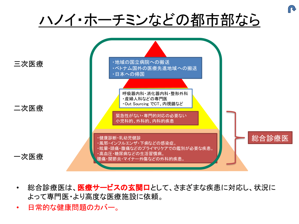 #93. ハノイ・ホーチミンなどの都市部なら 三次医療 二次医療 ・地域の国立病院への搬送 ・ベトナム国外の医療先進地域への搬送 ・日本への帰国 呼吸器内科・消化器内科・整形外科 ・産婦人科などの専門医 ・Out Sourcing でCT、内視鏡など 緊急性がない・専門的対応の必要ない 小児科的、外科的、内科的疾患 一次医療 • • ・健康診断・乳幼児健診 ・風邪・インフルエンザ・下痢などの感染症。 ・眩暈・頭痛・腹痛などのプライマリケアでの鑑別が必要な疾患。 ・高血圧・糖尿病などの生活習慣病。 腰痛・関節炎・マイナー外傷などの外科的疾患。 総合診療医 総合診療医は、医療サービスの玄関口として、さまざまな疾患に対応し、状況に よって専門医・より高度な医療施設に依頼。 日常的な健康問題のカバー。