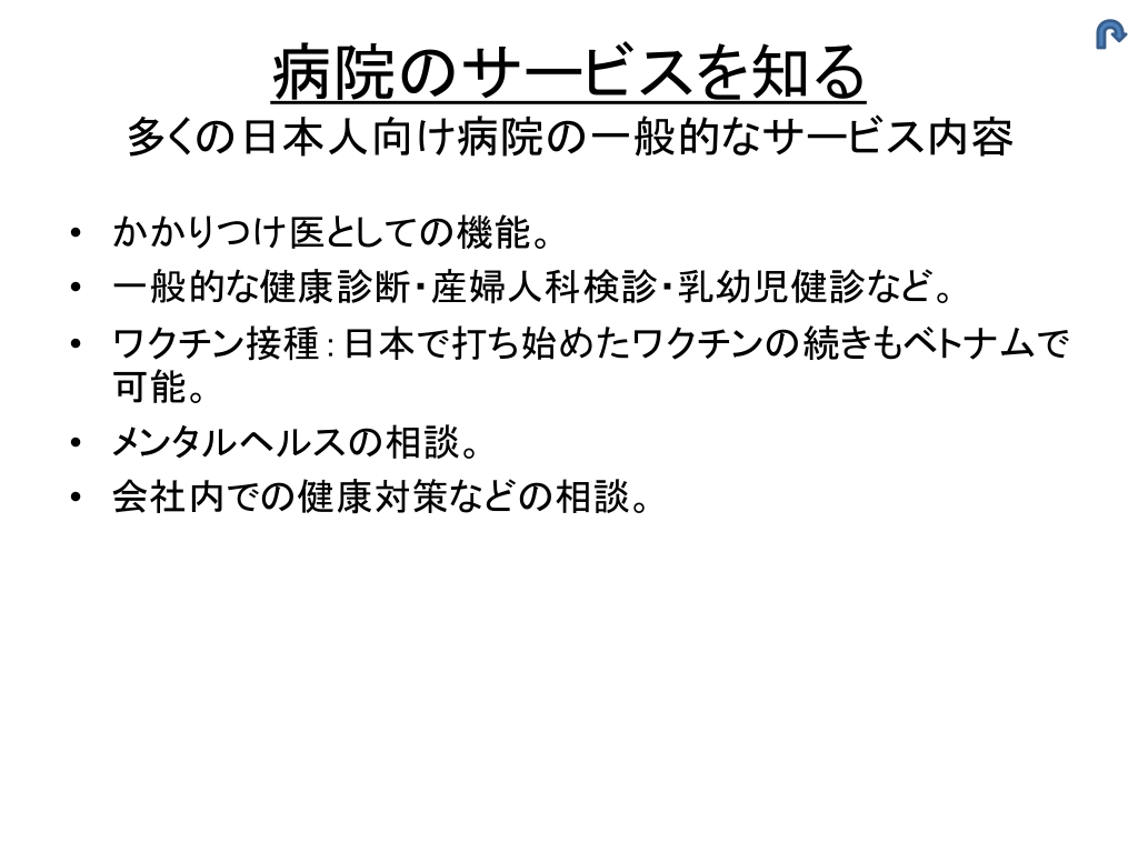 #94. 病院のサービスを知る 多くの日本人向け病院の一般的なサービス内容 • かかりつけ医としての機能。 • 一般的な健康診断・産婦人科検診・乳幼児健診など。 • ワクチン接種:日本で打ち始めたワクチンの続きもベトナムで 可能。 • メンタルヘルスの相談。 • 会社内での健康対策などの相談。