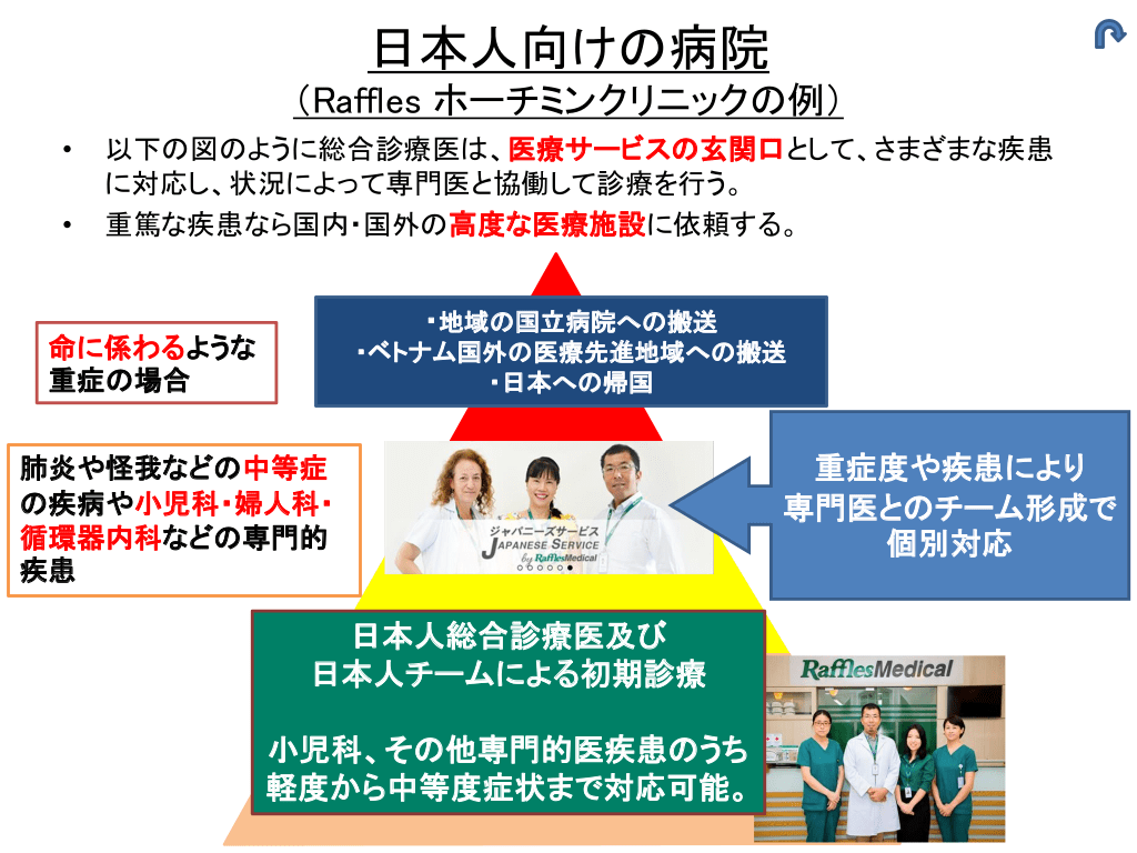 #95. 日本人向けの病院 (Raffles ホーチミンクリニックの例) • • 以下の図のように総合診療医は、医療サービスの玄関口として、さまざまな疾患 に対応し、状況によって専門医と協働して診療を行う。 重篤な疾患なら国内・国外の高度な医療施設に依頼する。 ・地域の国立病院への搬送 命に係わるような 重症の場合 ・ベトナム国外の医療先進地域への搬送 ・日本への帰国 肺炎や怪我などの中等症 の疾病や小児科・婦人科・ 循環器内科などの専門的 疾患 日本人総合診療医及び 日本人チームによる初期診療 小児科、その他専門的医疾患のうち 軽度から中等度症状まで対応可能。 重症度や疾患により 専門医とのチーム形成で 個別対応