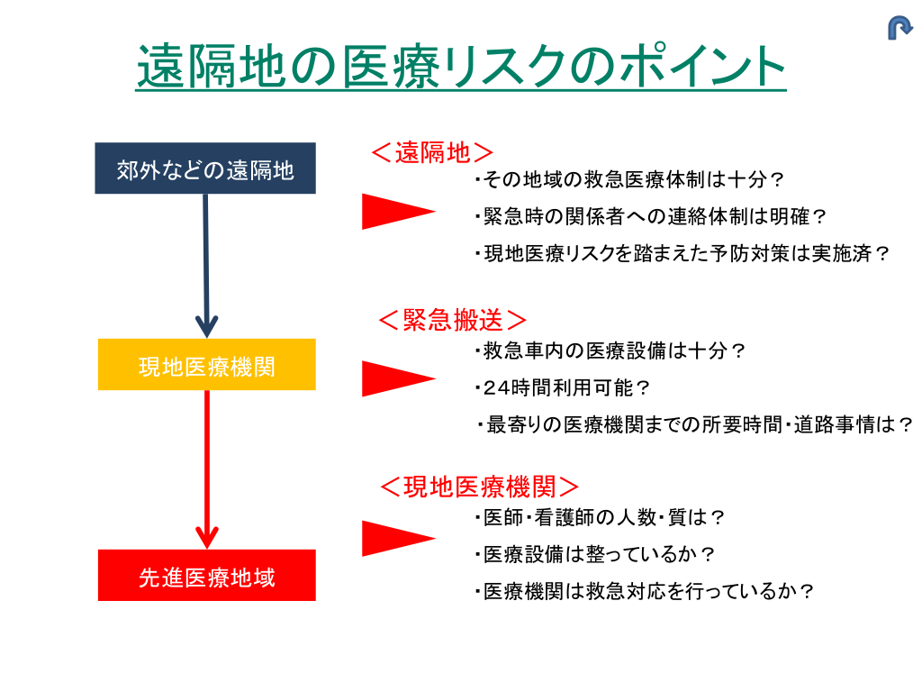 #96. 遠隔地の医療リスクのポイント 郊外などの遠隔地 <遠隔地> ・その地域の救急医療体制は十分? ・緊急時の関係者への連絡体制は明確? ・現地医療リスクを踏まえた予防対策は実施済? <緊急搬送> 現地医療機関 ・救急車内の医療設備は十分? ・24時間利用可能? ・最寄りの医療機関までの所要時間・道路事情は? <現地医療機関> ・医師・看護師の人数・質は? ・医療設備は整っているか? 先進医療地域 ・医療機関は救急対応を行っているか?