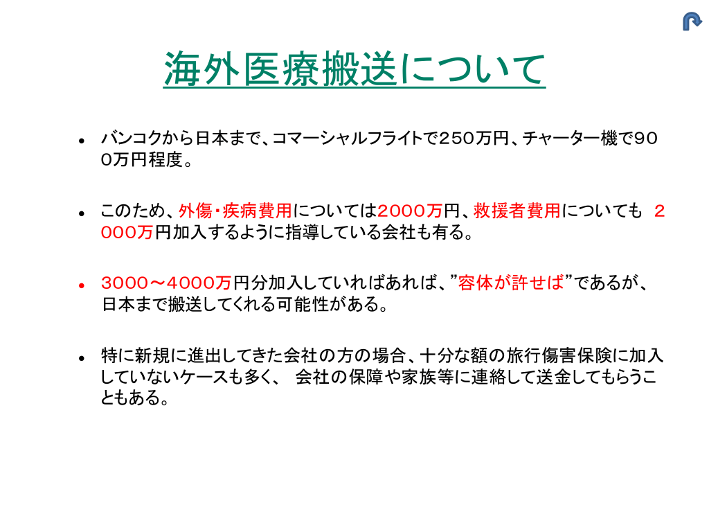 #97. 海外医療搬送について ⚫ ⚫ ⚫ ⚫ バンコクから日本まで、コマーシャルフライトで250万円、チャーター機で90 0万円程度。 このため、外傷・疾病費用については2000万円、救援者費用についても 2 000万円加入するように指導している会社も有る。 3000~4000万円分加入していればあれば、”容体が許せば”であるが、 日本まで搬送してくれる可能性がある。 特に新規に進出してきた会社の方の場合、十分な額の旅行傷害保険に加入 していないケースも多く、 会社の保障や家族等に連絡して送金してもらうこ ともある。