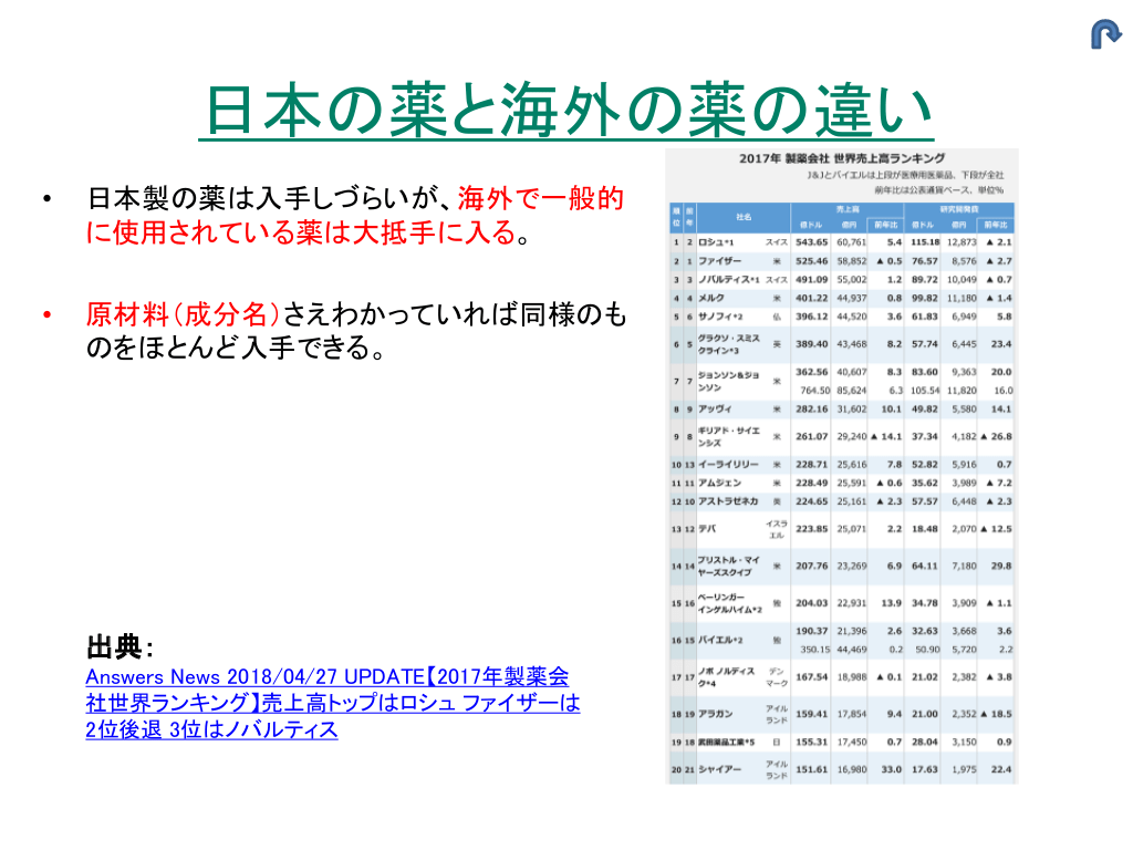 #98. 日本の薬と海外の薬の違い • 日本製の薬は入手しづらいが、海外で一般的 に使用されている薬は大抵手に入る。 • 原材料(成分名)さえわかっていれば同様のも のをほとんど入手できる。 出典: Answers News 2018/04/27 UPDATE【2017年製薬会 社世界ランキング】売上高トップはロシュ ファイザーは 2位後退 3位はノバルティス