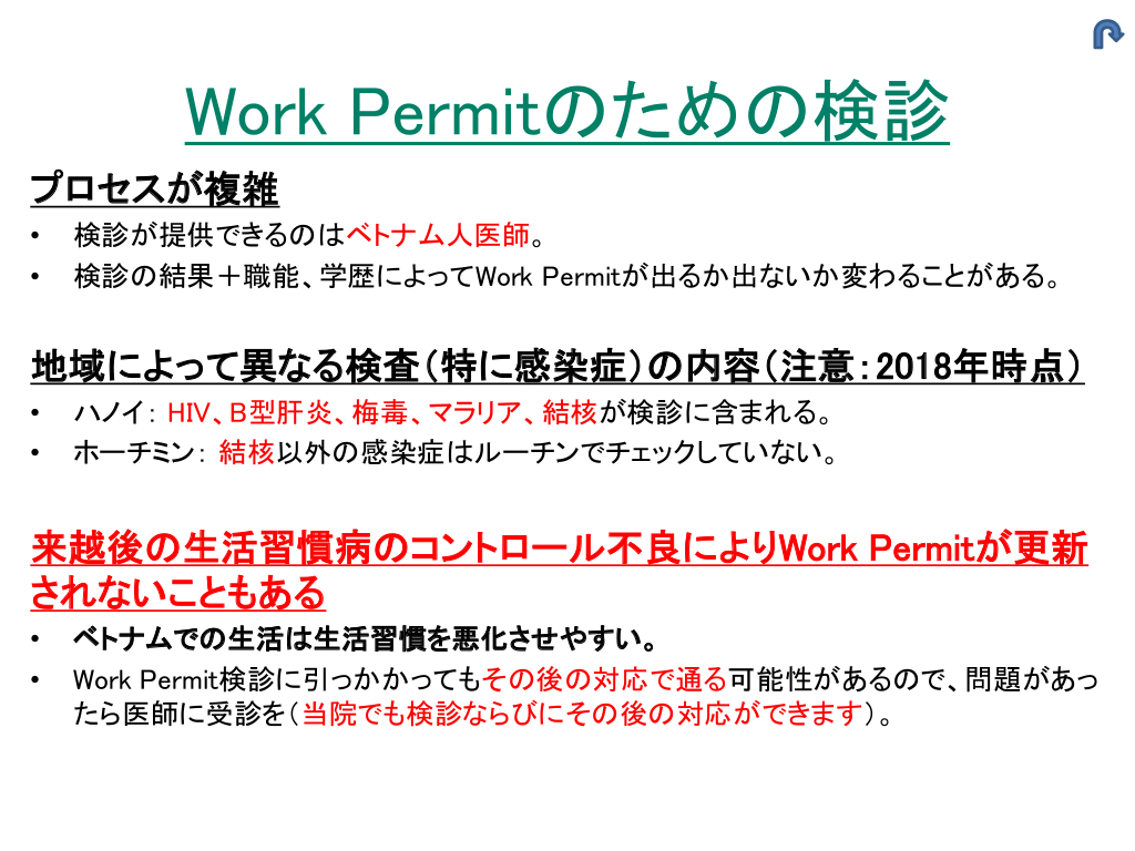 #99. Work Permitのための検診 プロセスが複雑 • • 検診が提供できるのはベトナム人医師。 検診の結果+職能、学歴によってWork Permitが出るか出ないか変わることがある。 地域によって異なる検査(特に感染症)の内容(注意:2018年時点) • • ハノイ: HIV、B型肝炎、梅毒、マラリア、結核が検診に含まれる。 ホーチミン: 結核以外の感染症はルーチンでチェックしていない。 来越後の生活習慣病のコントロール不良によりWork Permitが更新 されないこともある • • ベトナムでの生活は生活習慣を悪化させやすい。 Work Permit検診に引っかかってもその後の対応で通る可能性があるので、問題があっ たら医師に受診を(当院でも検診ならびにその後の対応ができます)。