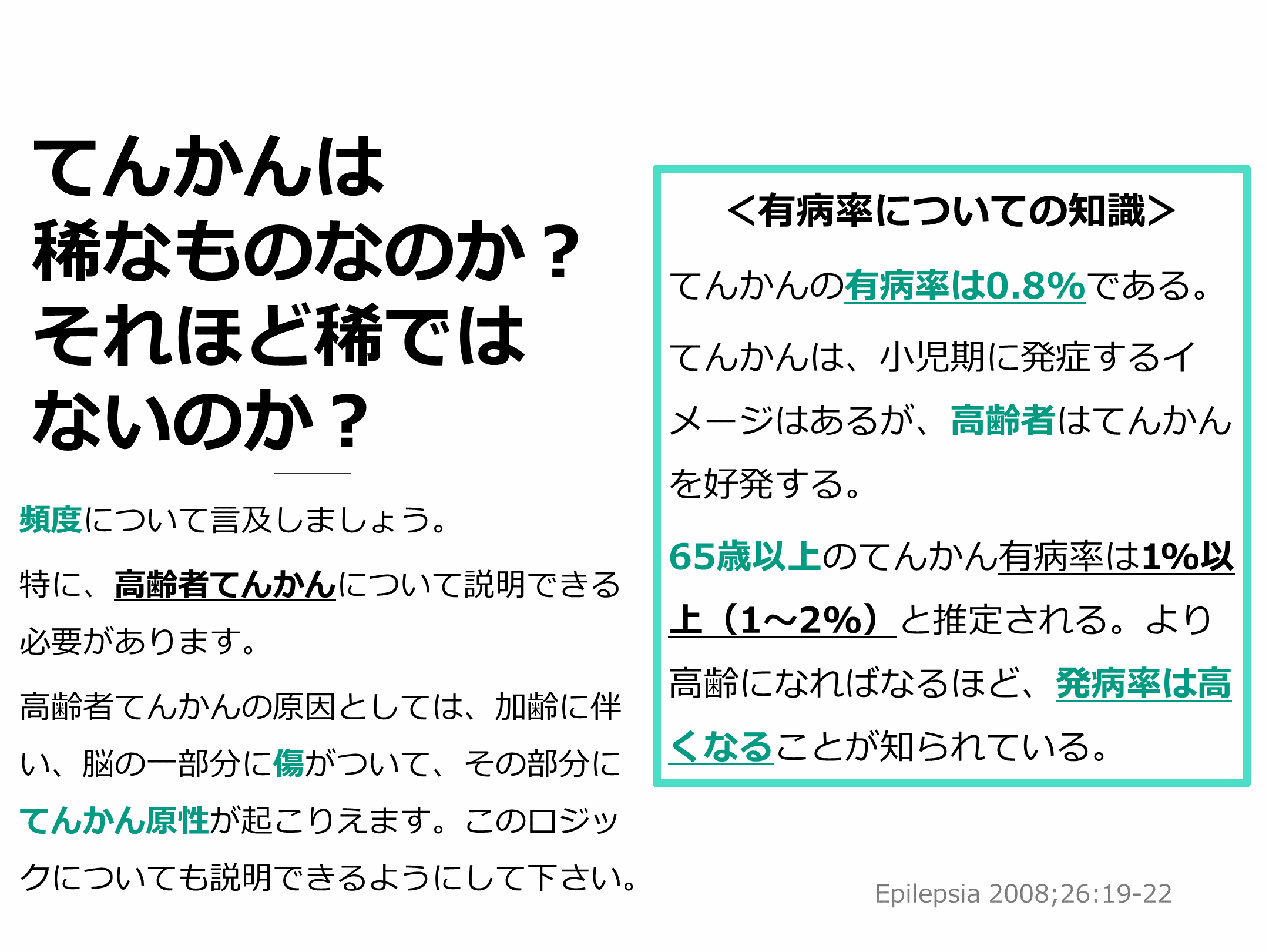 高齢者てんかんの原因としては、加齢に伴い、脳の一部分に傷がついて、その部分にてんかん原性が起こりえます。このロジックについても説明できるようにして下さい。 <有病率についての知識>
