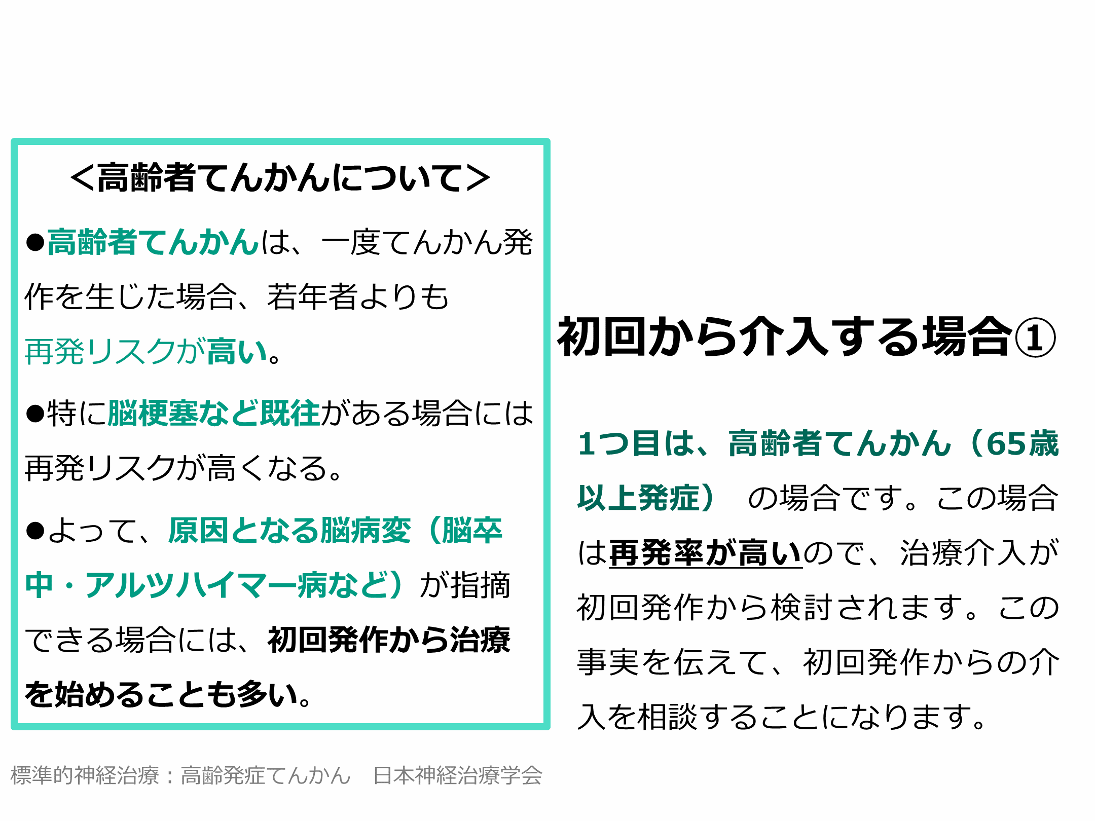 #10. 初回から介入する場合① 1つ目は、高齢者てんかん(65歳以上発症) の場合です。この場合は再発率が高いので、治療介入が初回発作から検討されます。この事実を伝えて、初回発作からの介入を相談することになります。 <高齢者てんかんについて>