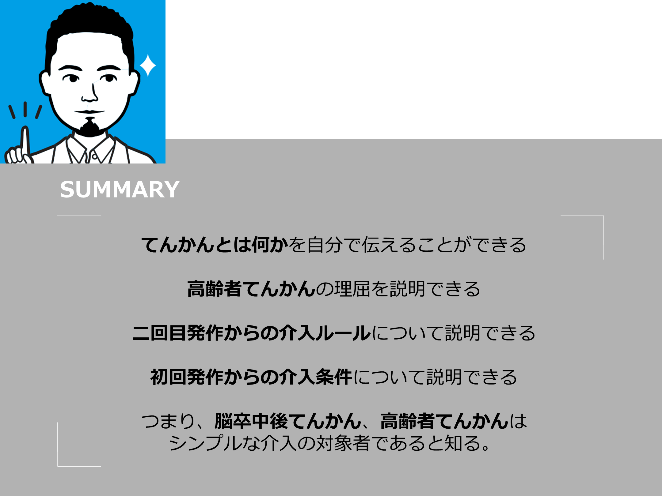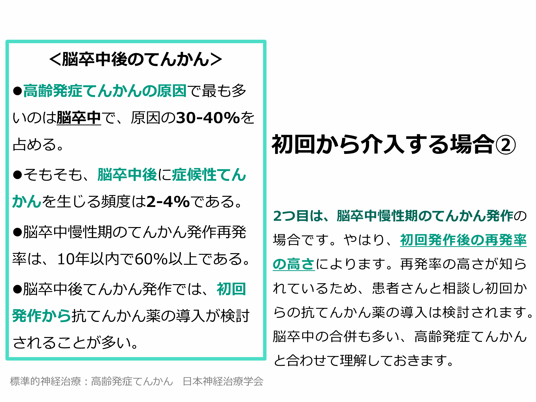 #11. 初回から介入する場合② 2つ目は、脳卒中慢性期のてんかん発作の場合です。やはり、初回発作後の再発率の高さによります。再発率の高さが知られているため、患者さんと相談し初回からの抗てんかん薬の導入は検討されます。脳卒中の合併も多い、高齢発症てんかんと合わせて理解しておきます。 <脳卒中後のてんかん>