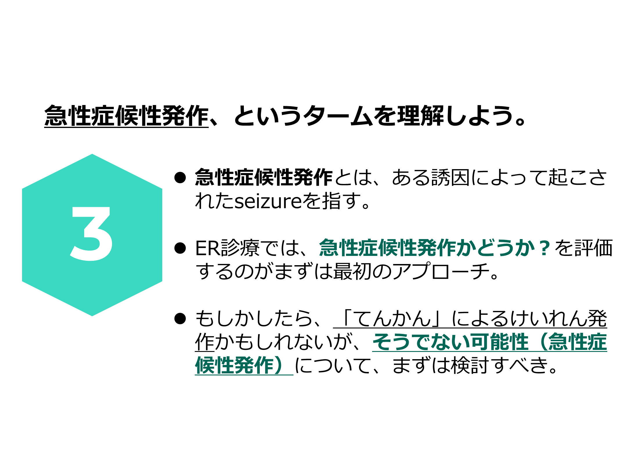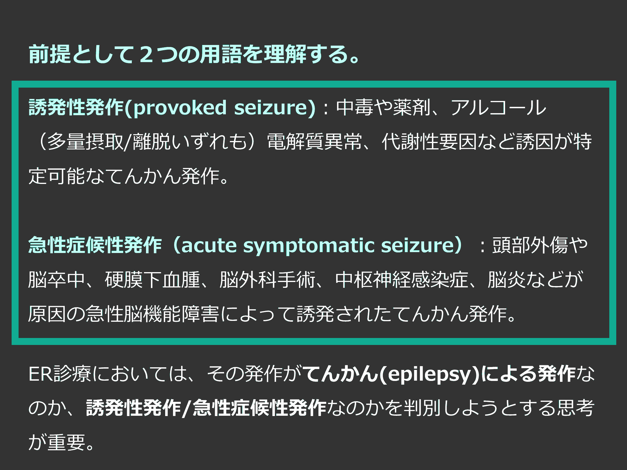 ER診療においては、その発作がてんかん(epilepsy)による発作なのか、誘発性発作/急性症候性発作なのかを判別しようとする思考が重要。