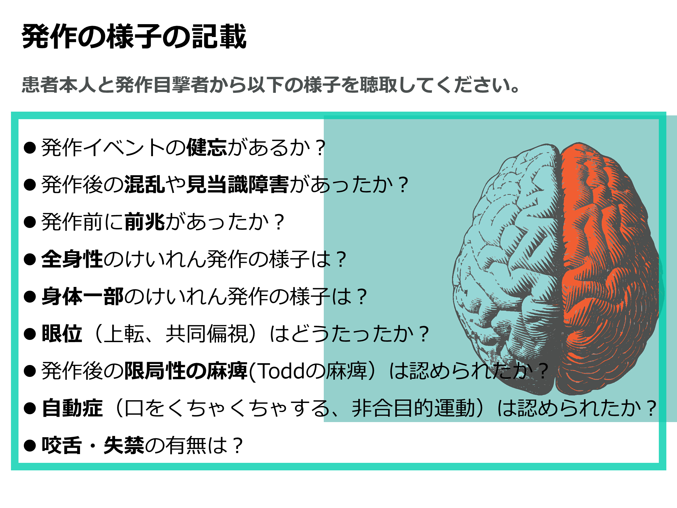 患者本人と発作目撃者から以下の様子を聴取してください。