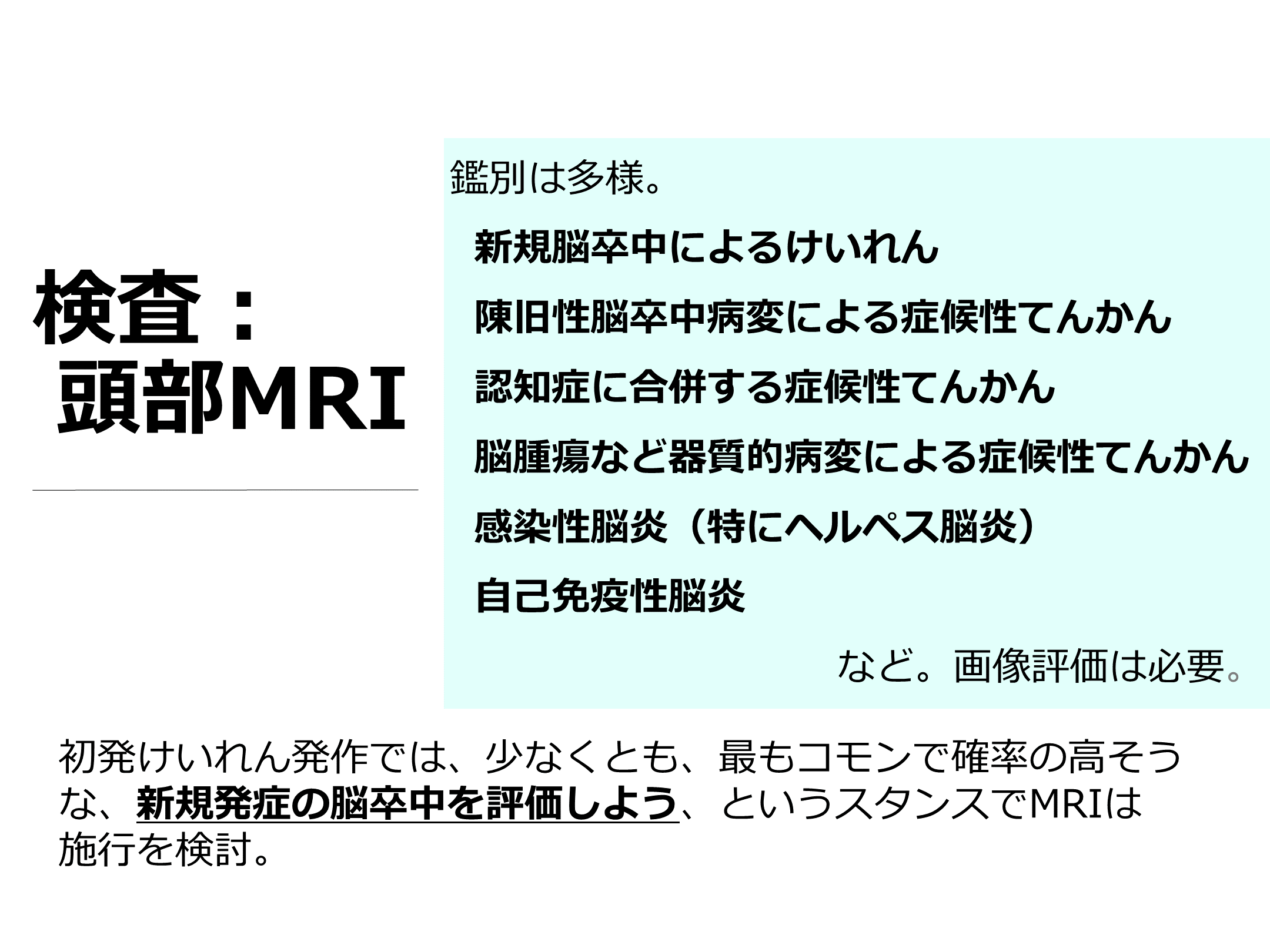 よって、原因となる脳病変(脳卒中・アルツハイマー病など)が指摘できる場合には、初回発作から治療を始めることも多い。 標準的神経治療:高齢発症てんかん 日本神経治療学会