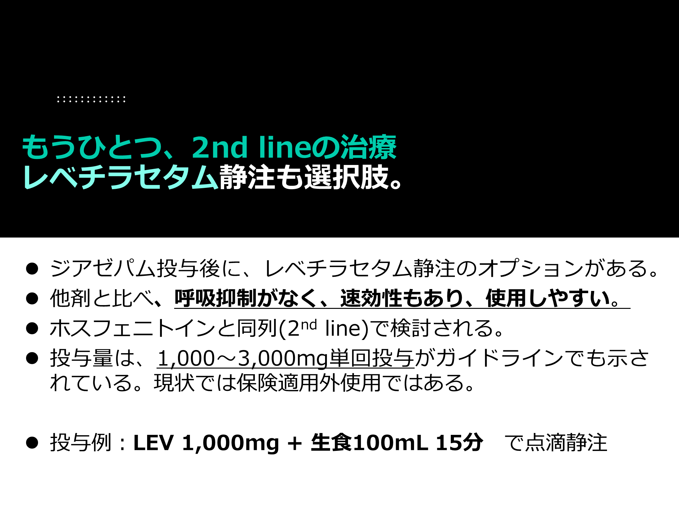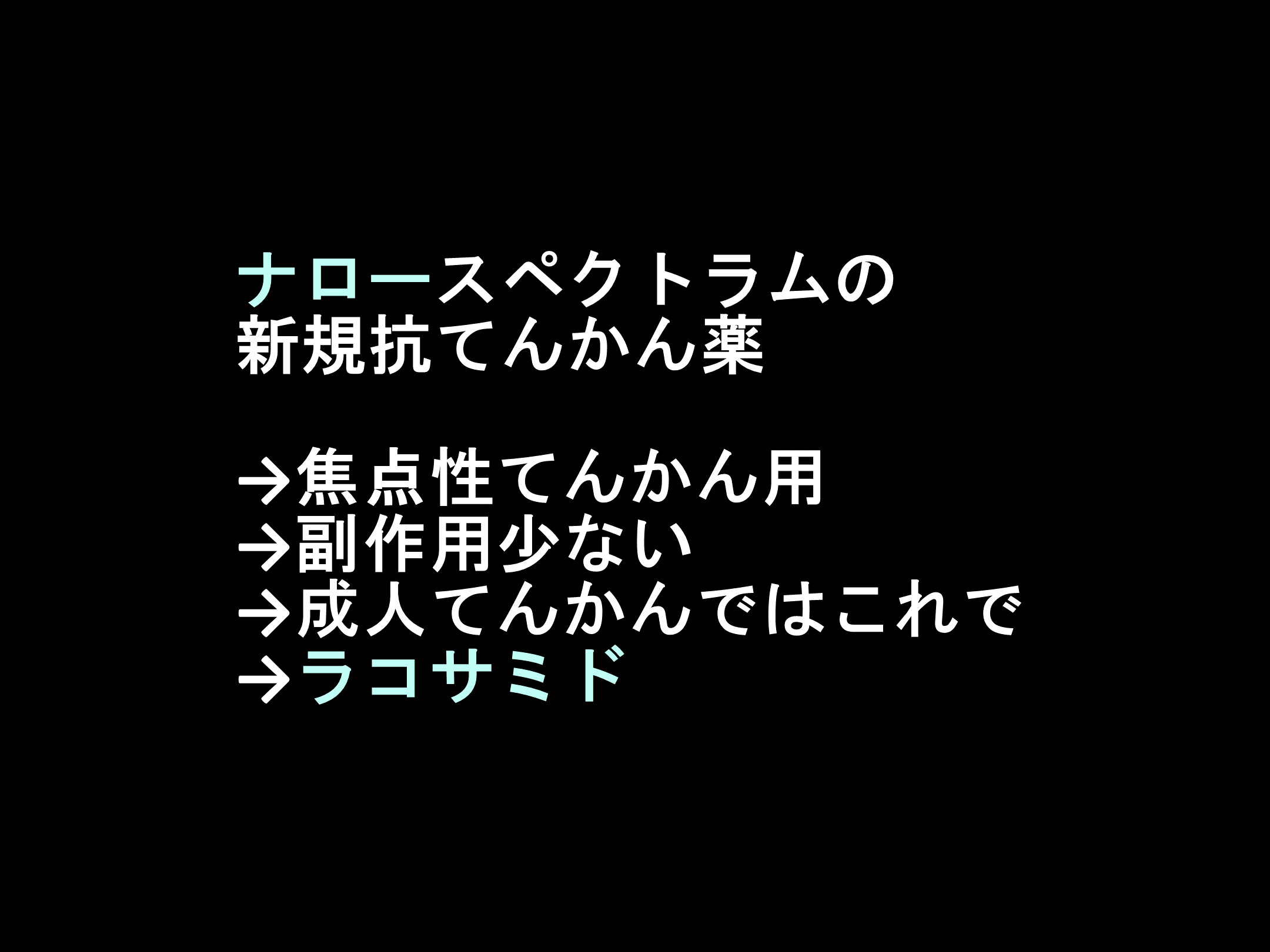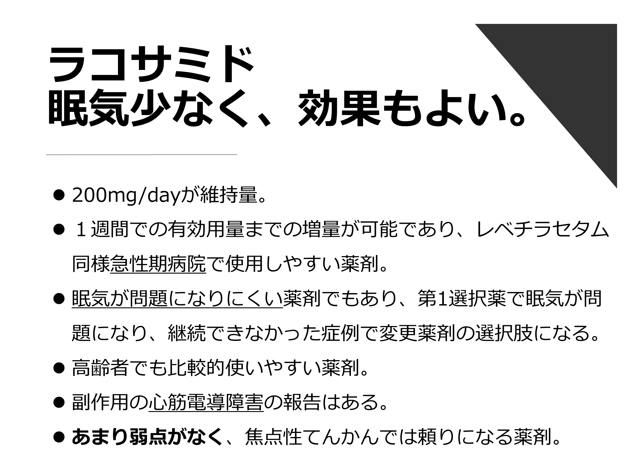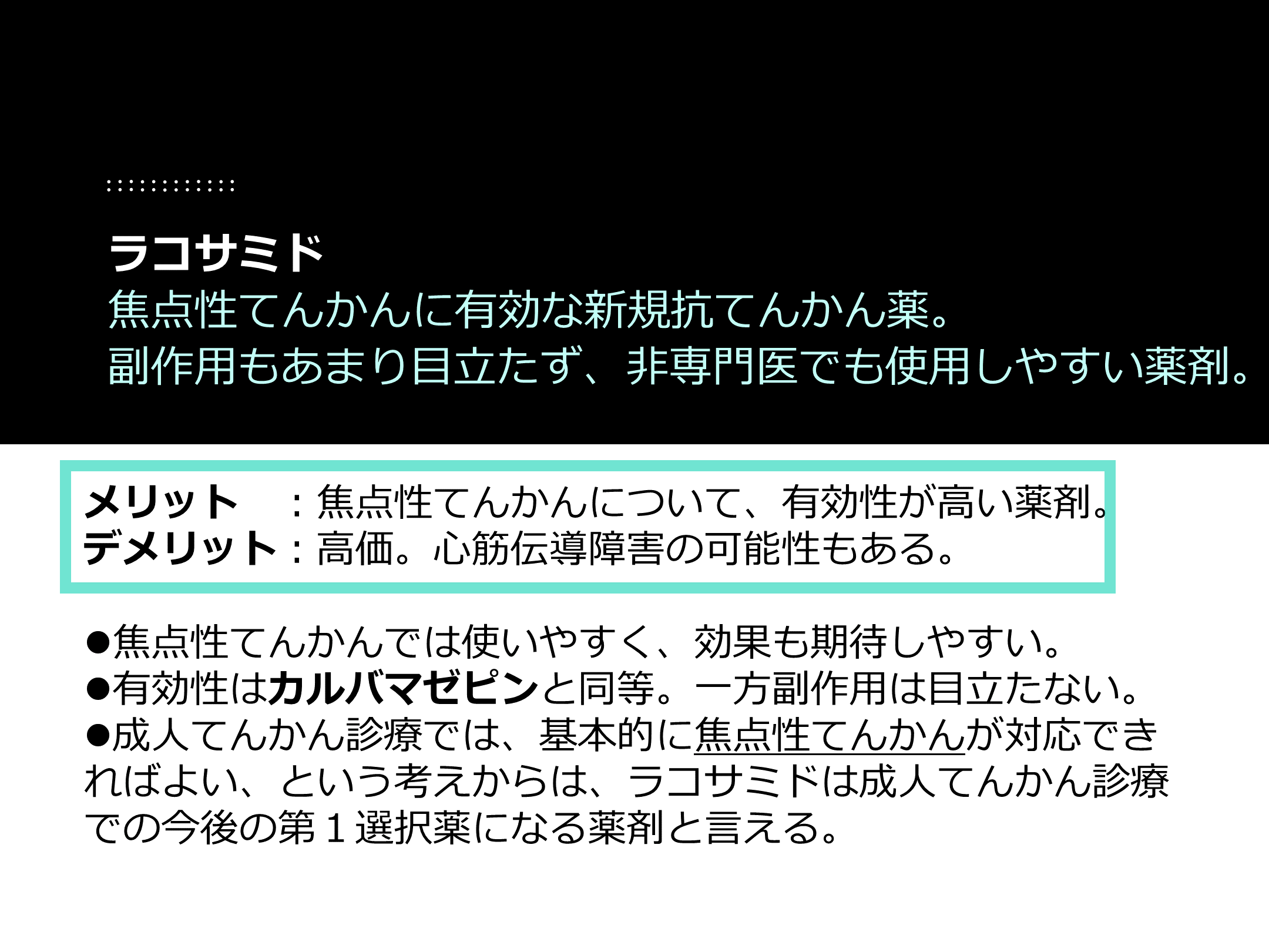 成人てんかん診療では、基本的に焦点性てんかんが対応できればよい、という考えからは、ラコサミドは成人てんかん診療での今後の第1選択薬になる薬剤と言える。 ラコサミド