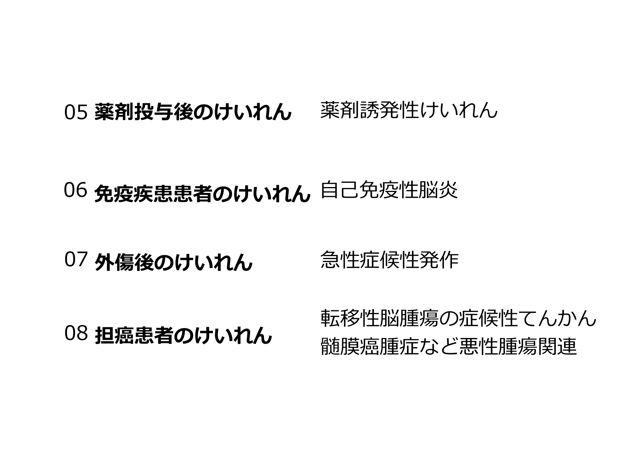 急性症候性発作(acute symptomatic seizure):頭部外傷や脳卒中、硬膜下血腫、脳外科手術、中枢神経感染症、脳炎などが原因の急性脳機能障害によって誘発されたてんかん発作。