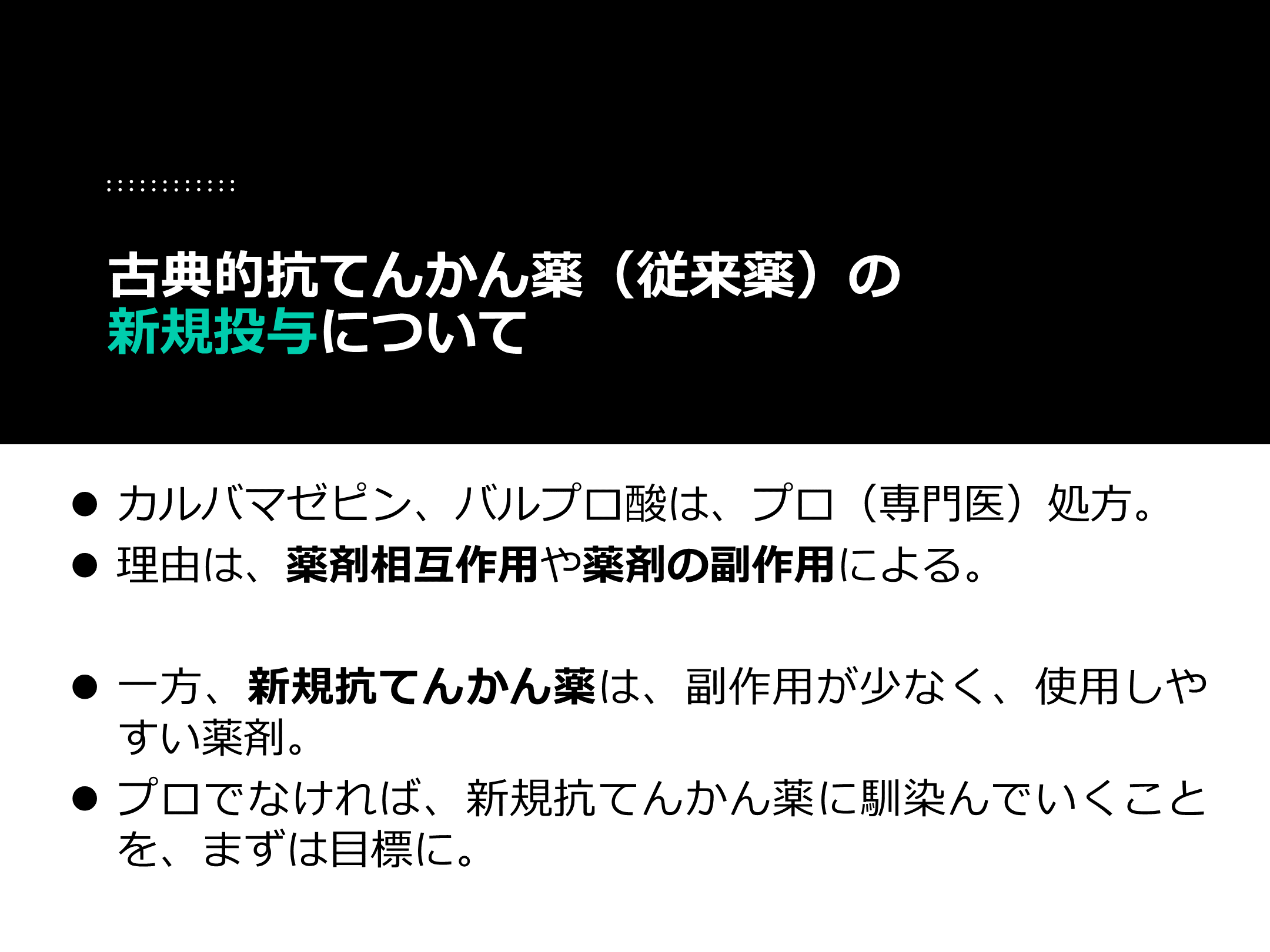 新規は高価である。 安価なので古典的薬剤に。バルプロ酸は使いやすいが、効果が不安である。