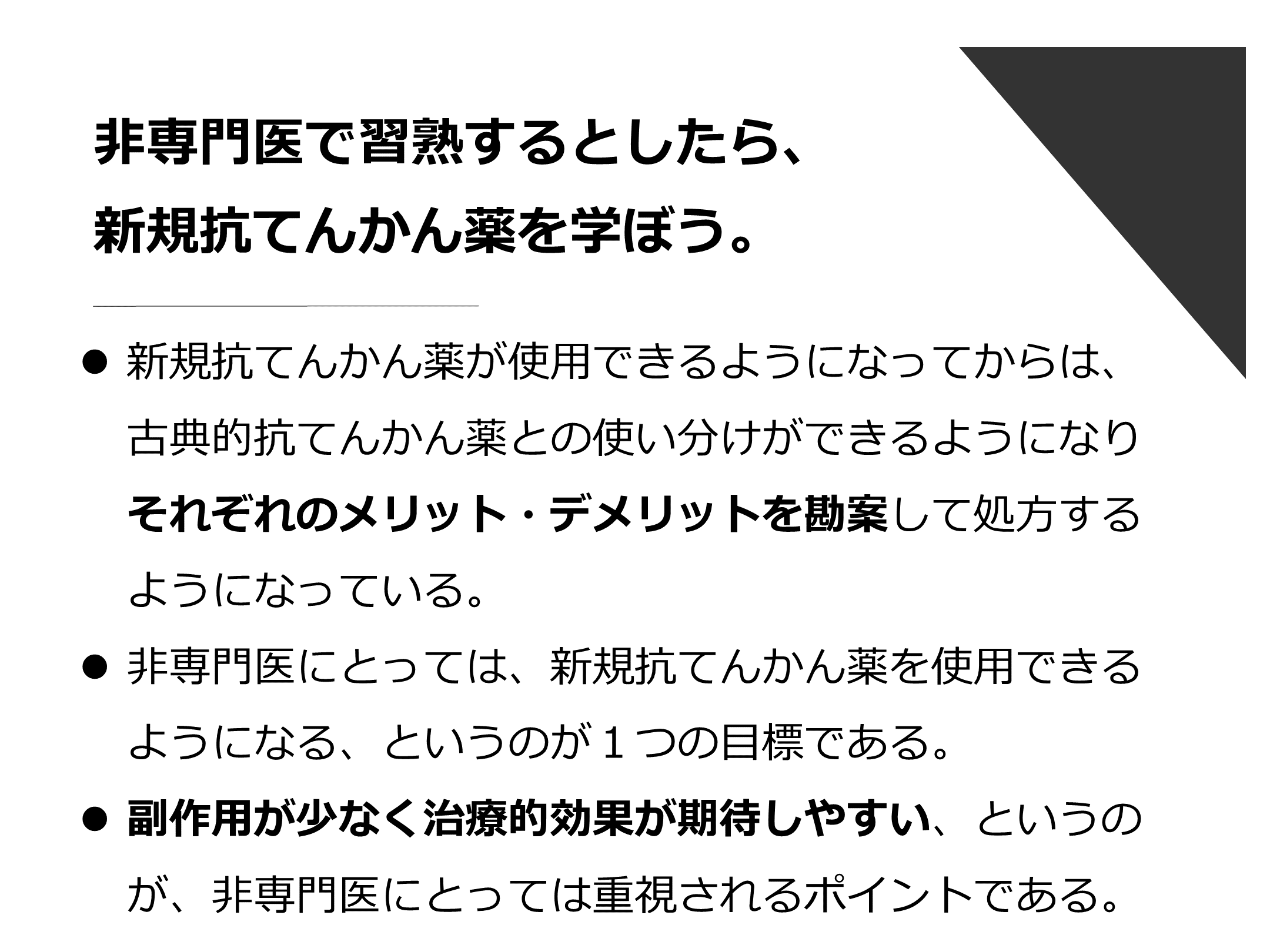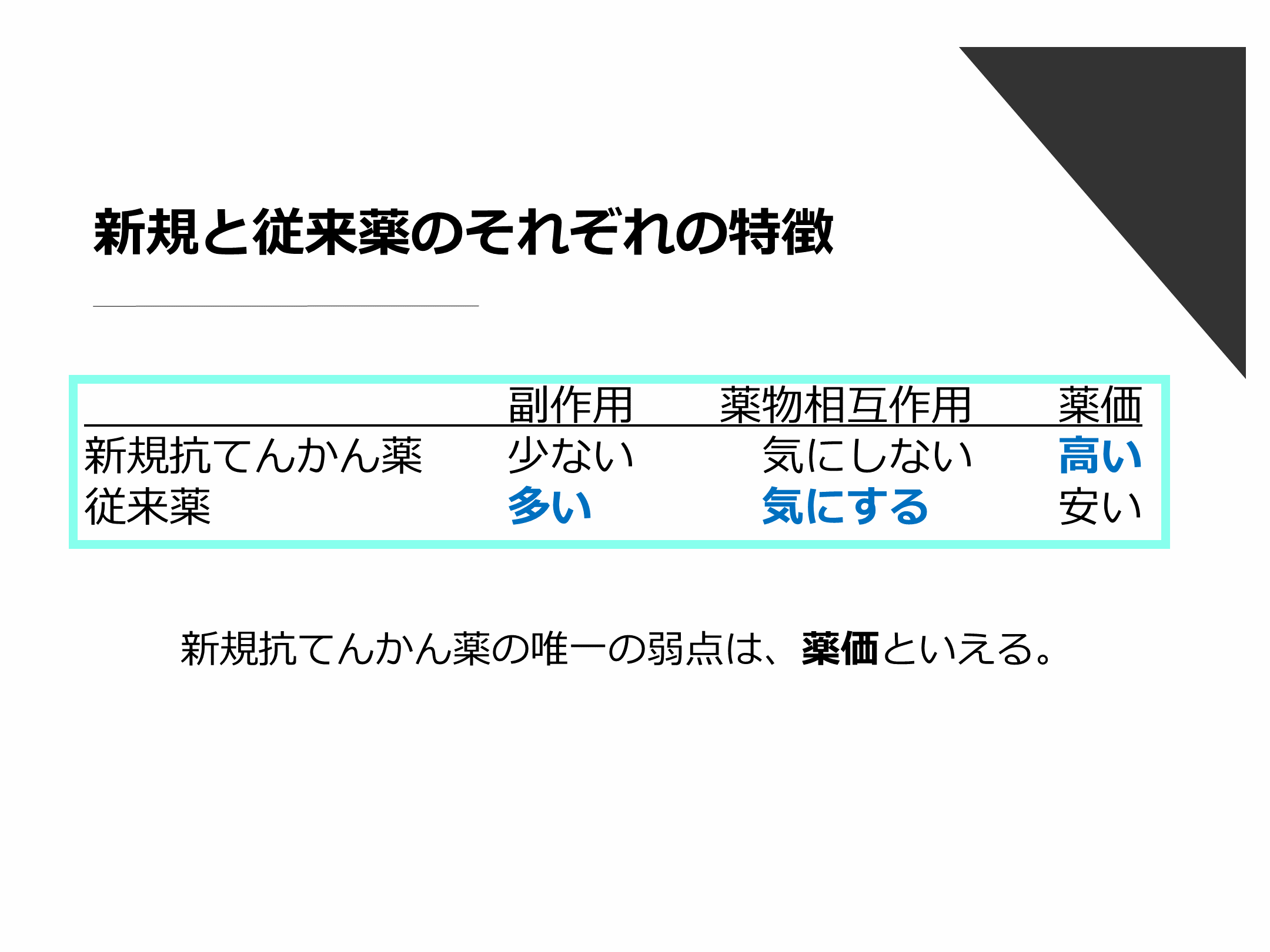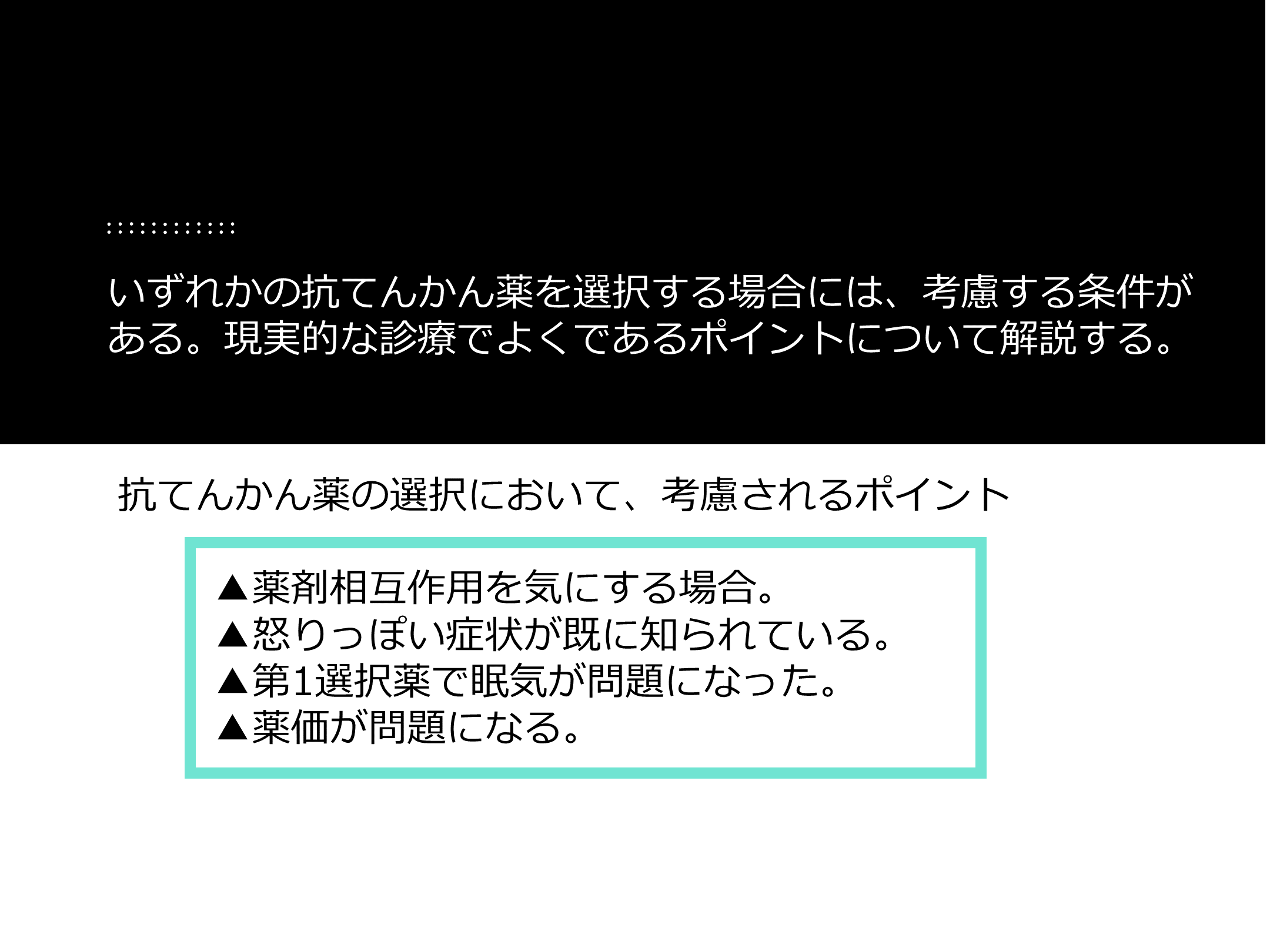 コスト、眠気、精神症状、薬物相互作用などを考慮。