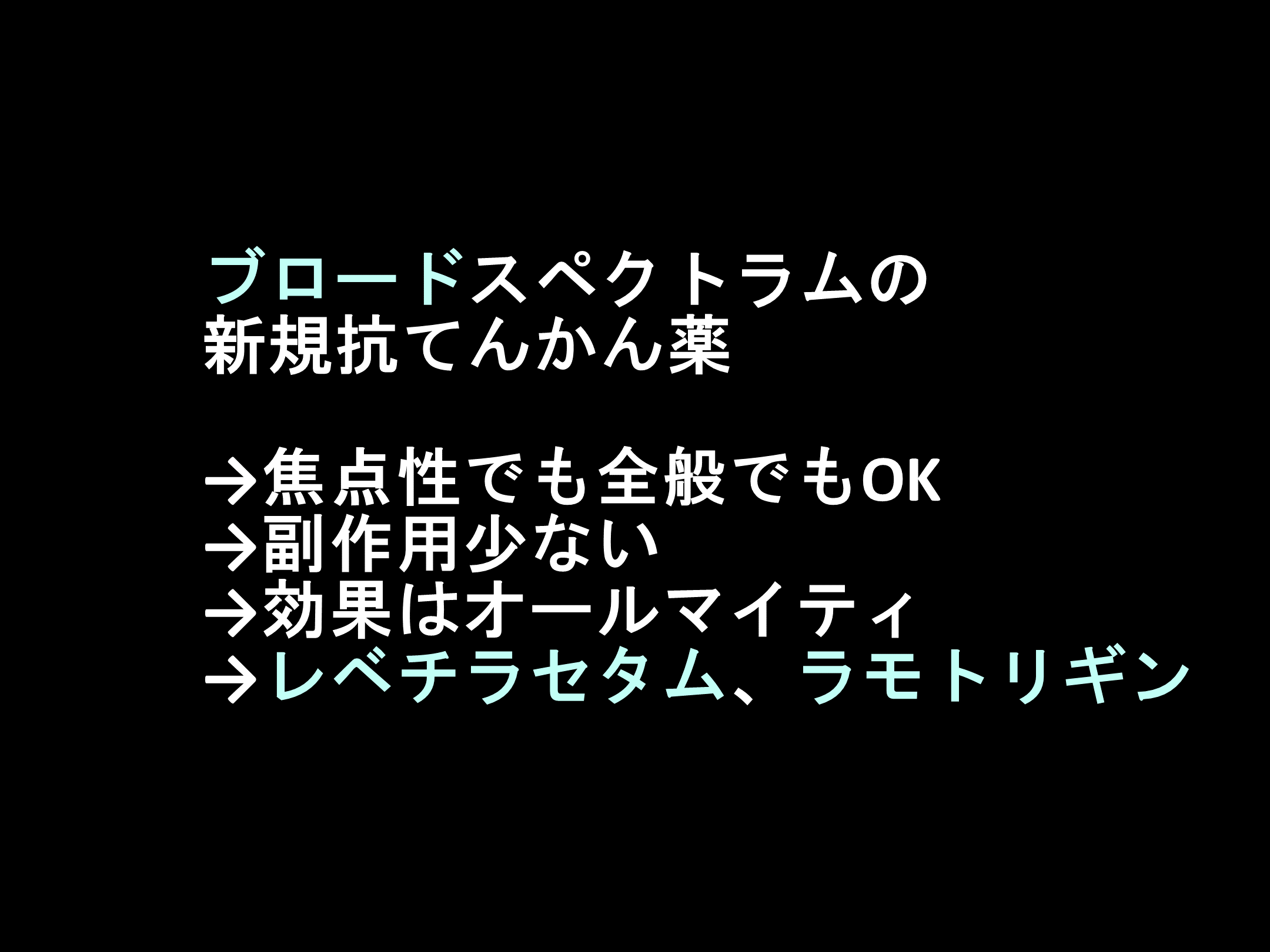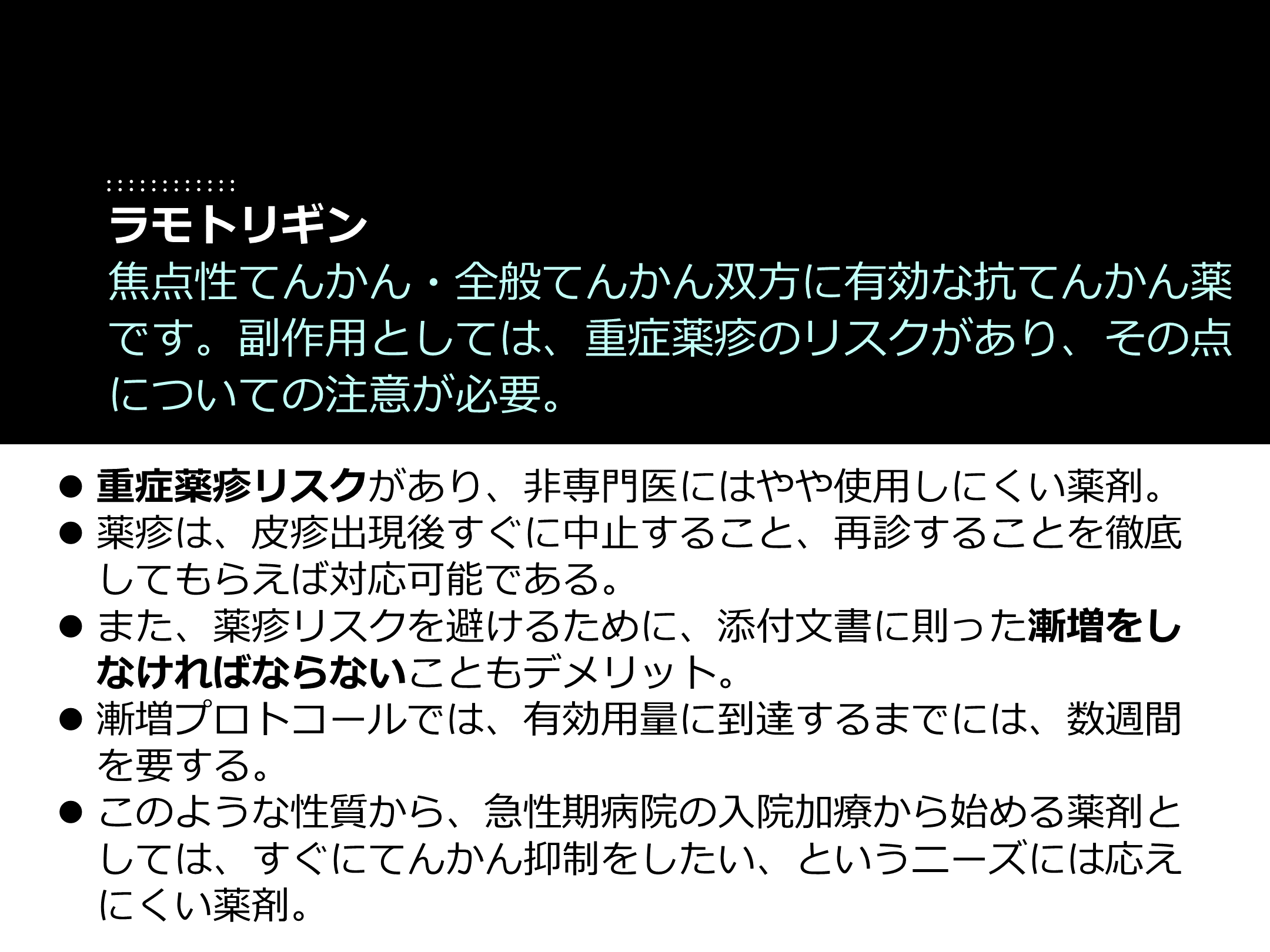 この場合は、新規抗てんかん薬では、 ラコサミド、ラモトリギンが選択肢になる。