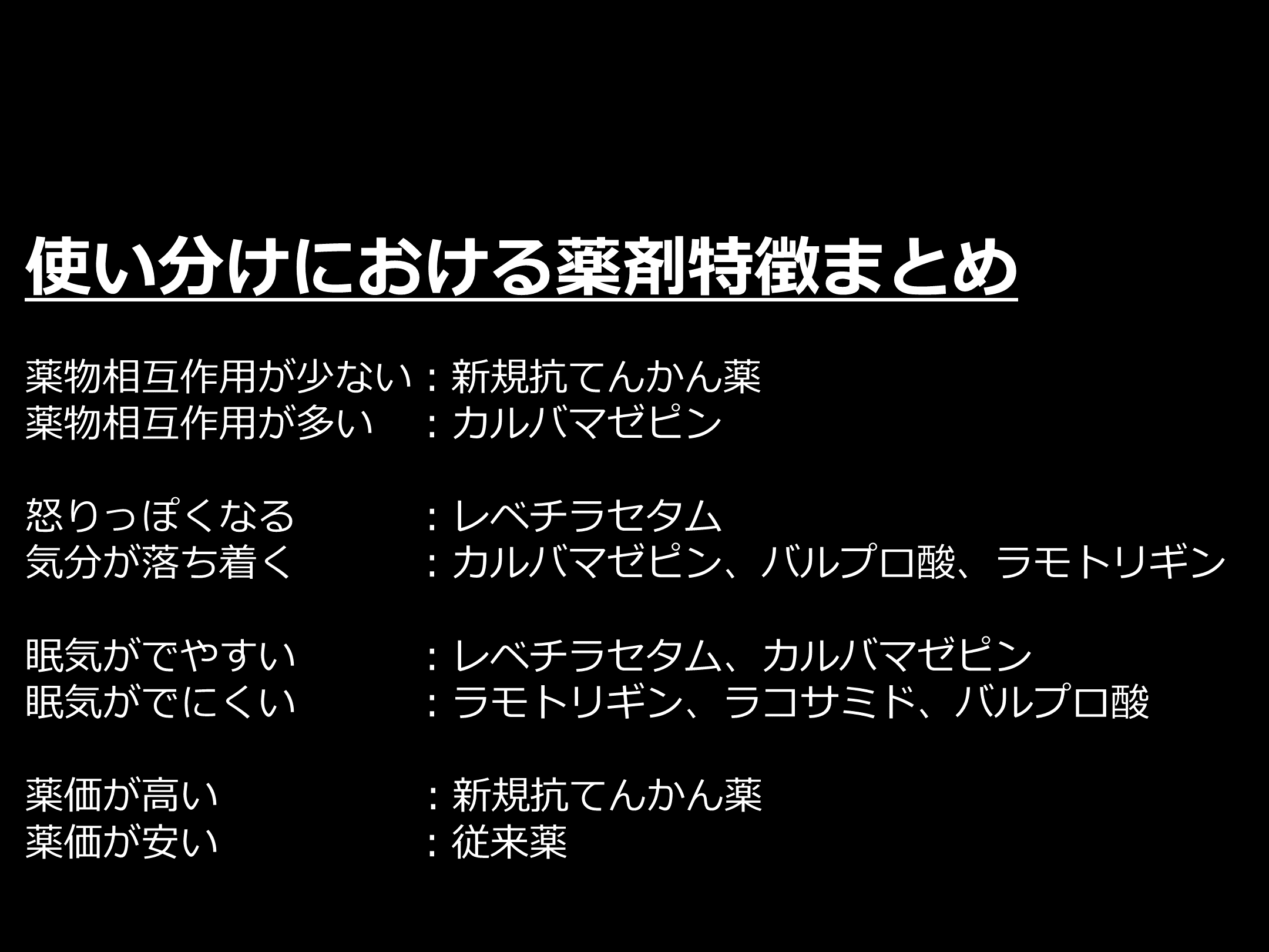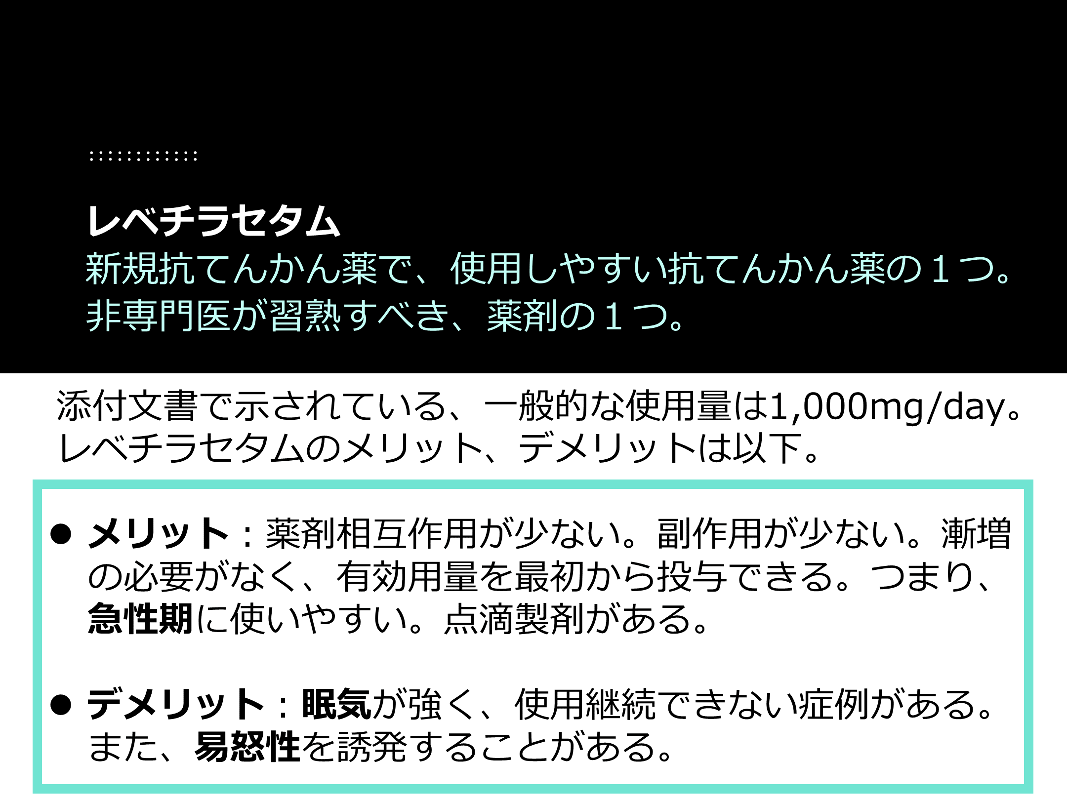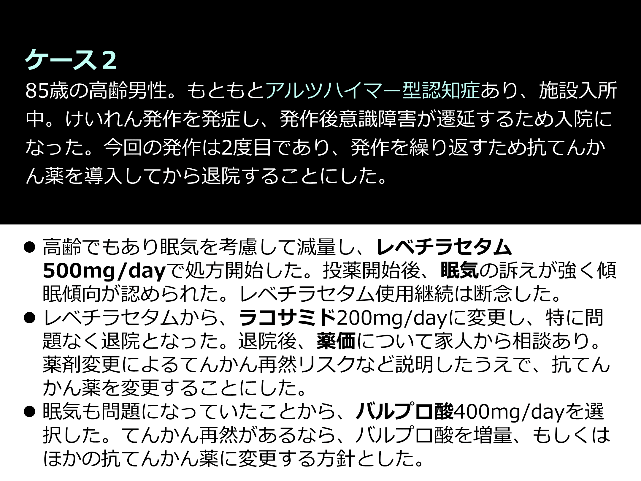 眠気も問題になっていたことから、バルプロ酸400mg/dayを選択した。てんかん再然があるなら、バルプロ酸を増量、もしくはほかの抗てんかん薬に変更する方針とした。 高齢者てんかんの新規導入薬としては使いやすいので、 レベチラセタム。 ラコサミドは眠気 少なく使いやすい。
