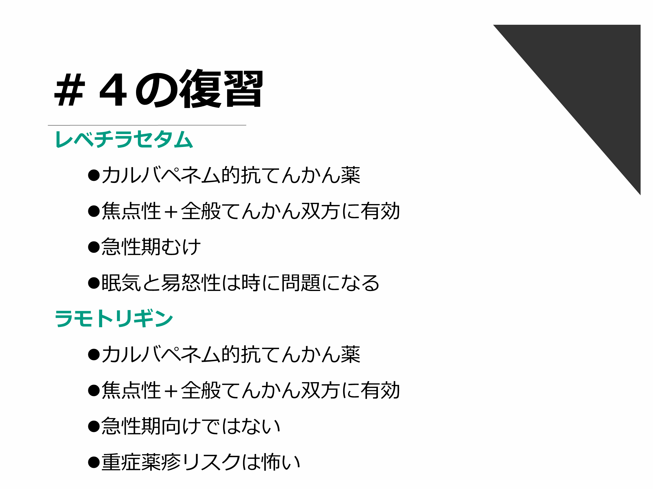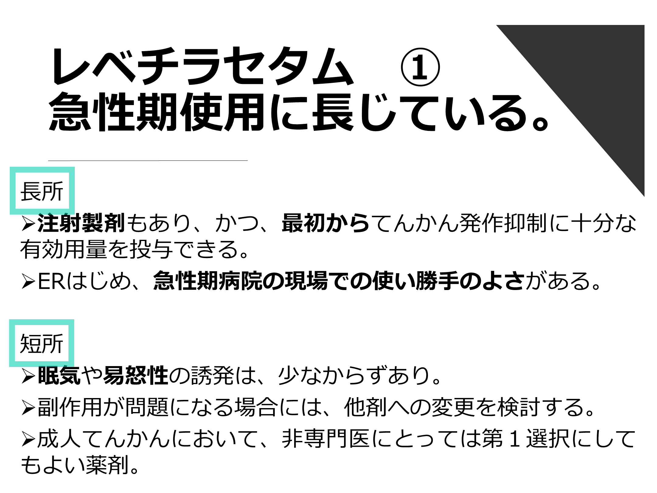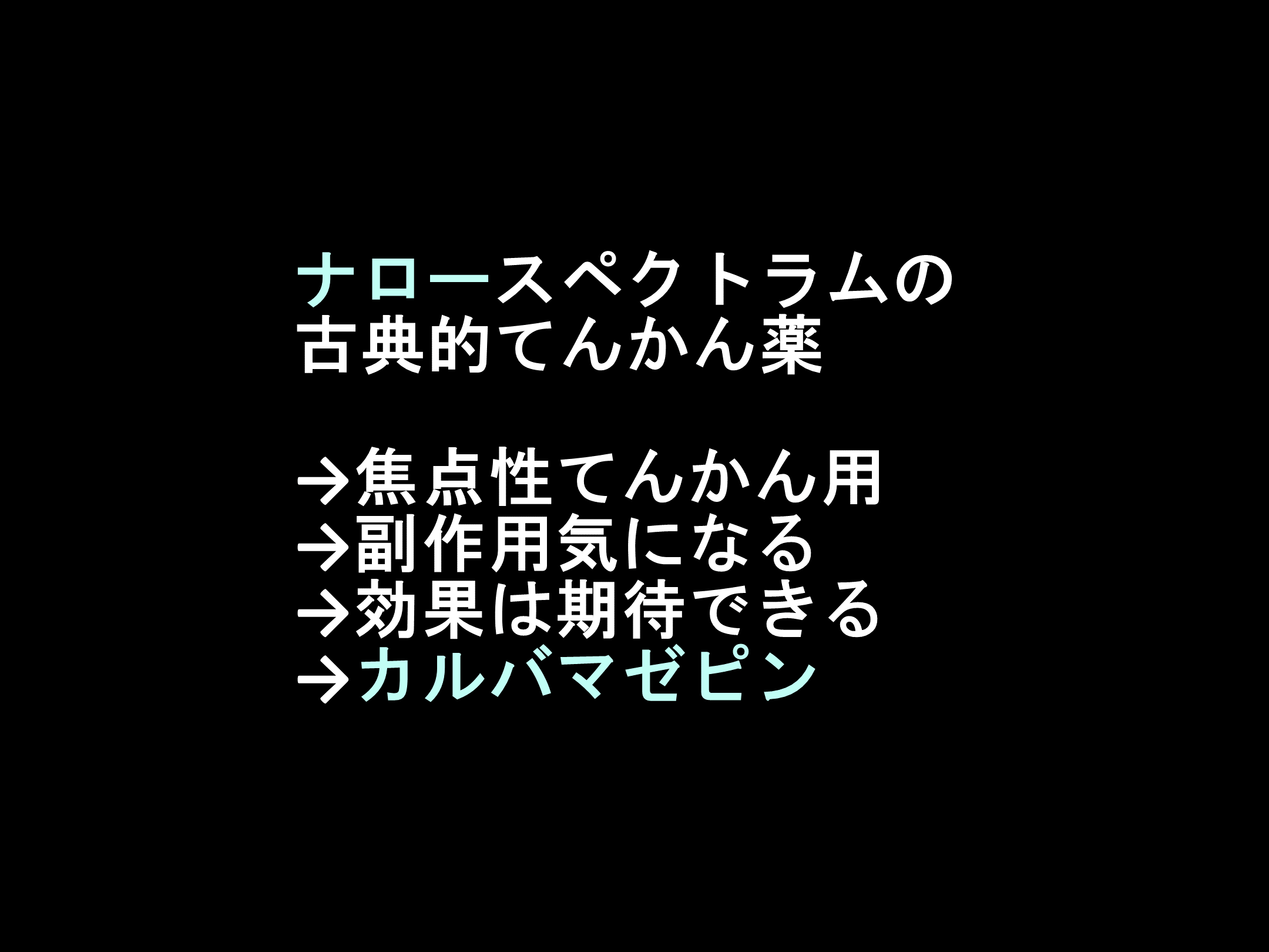 眠気も問題になっていたことから、バルプロ酸400mg/dayを選択した。てんかん再然があるなら、バルプロ酸を増量、もしくはほかの抗てんかん薬に変更する方針とした。 高齢者てんかんの新規導入薬としては使いやすいので、 レベチラセタム。 ラコサミドは眠気 少なく使いやすい。