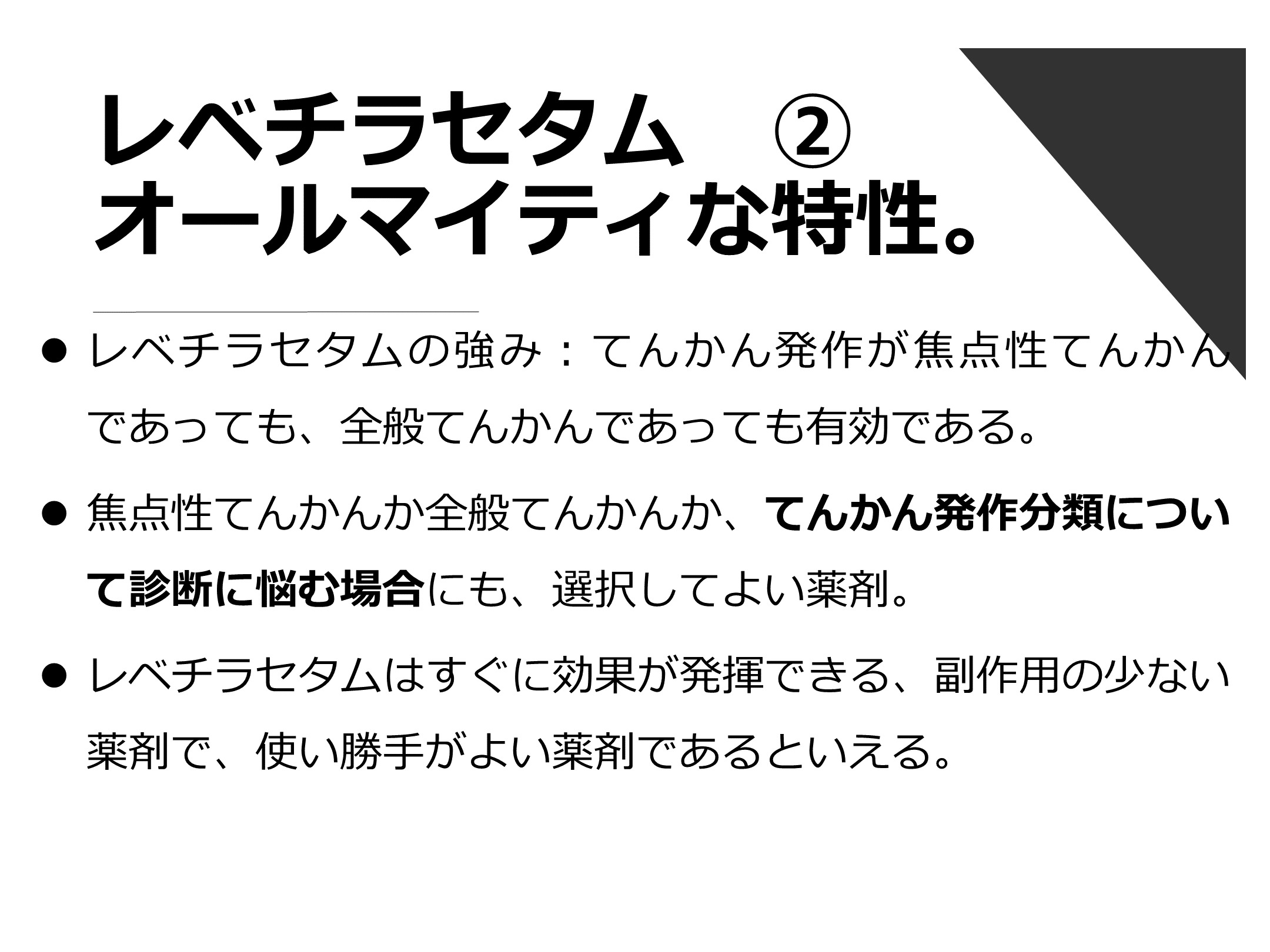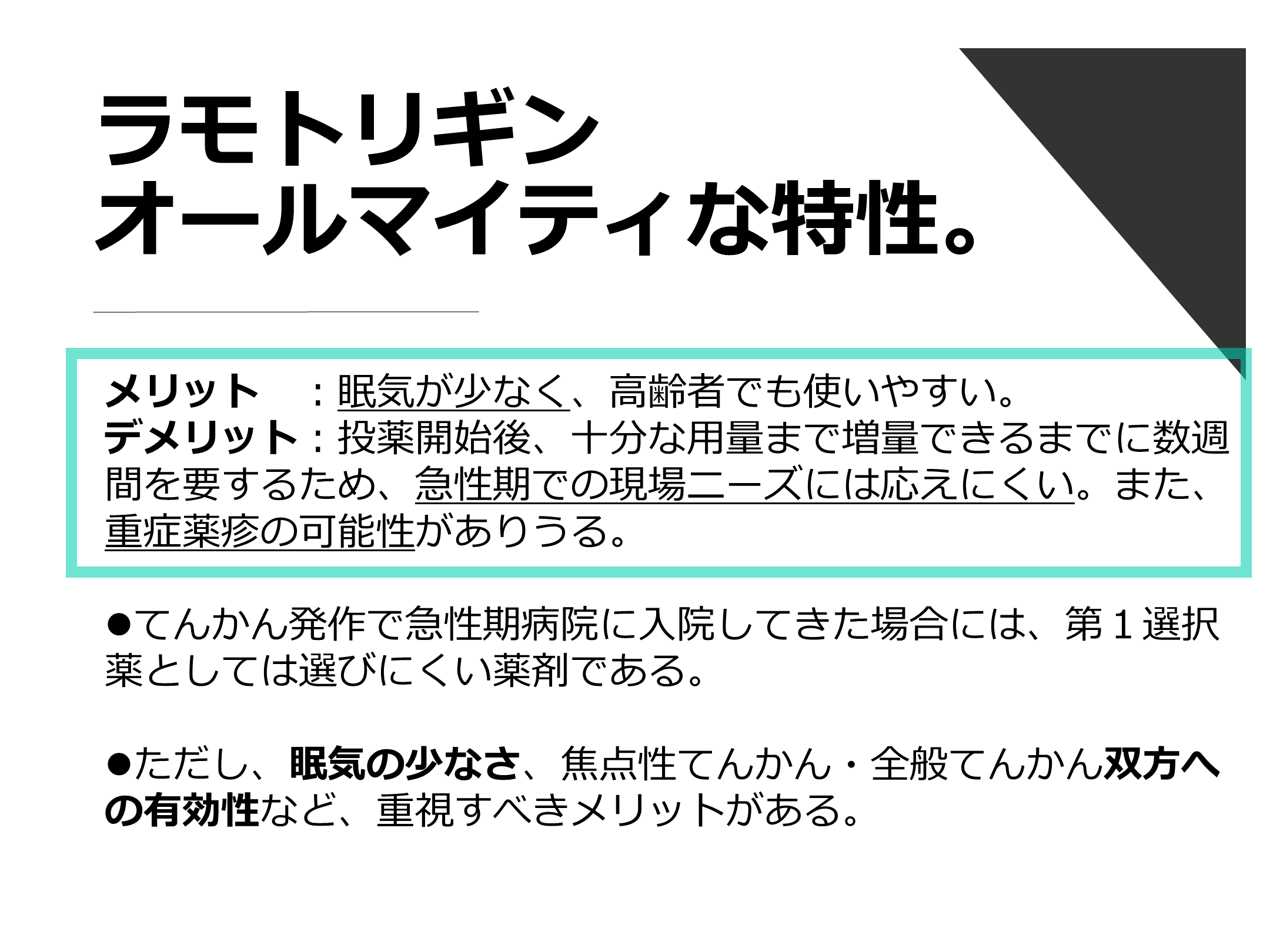 基本的には焦点性てんかんで使用する。眠気など問題になりにくく、選択肢の1つとして知っておいてもいい薬剤。