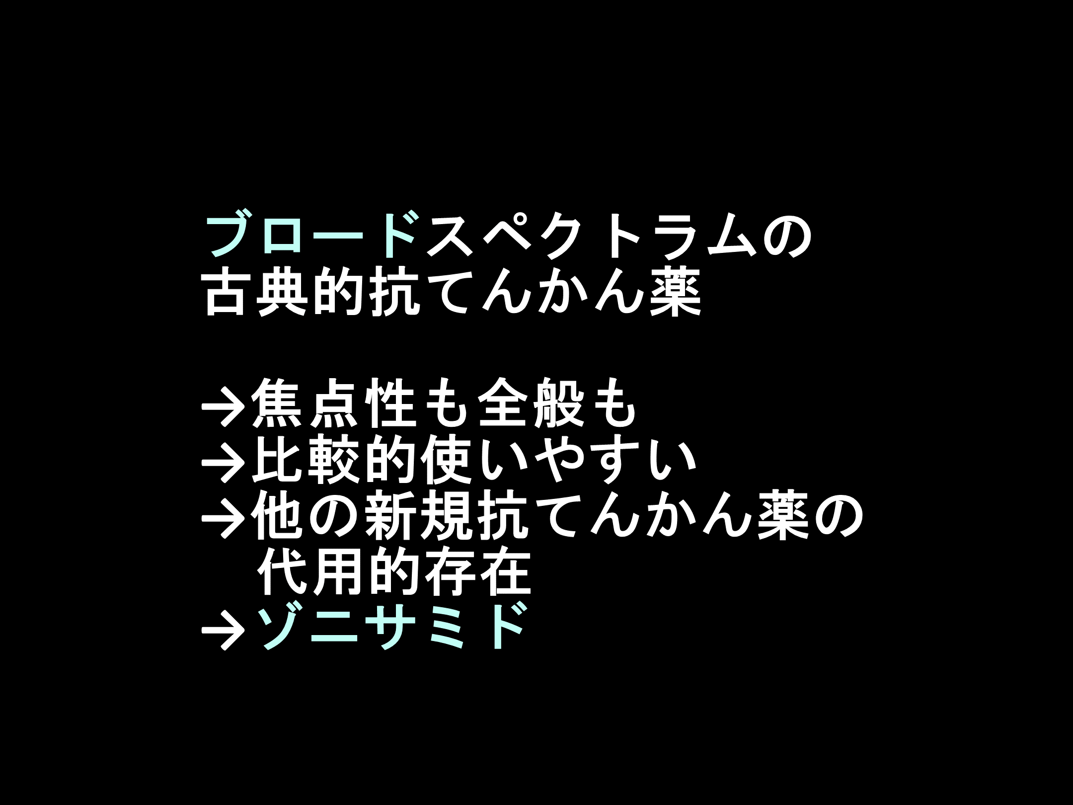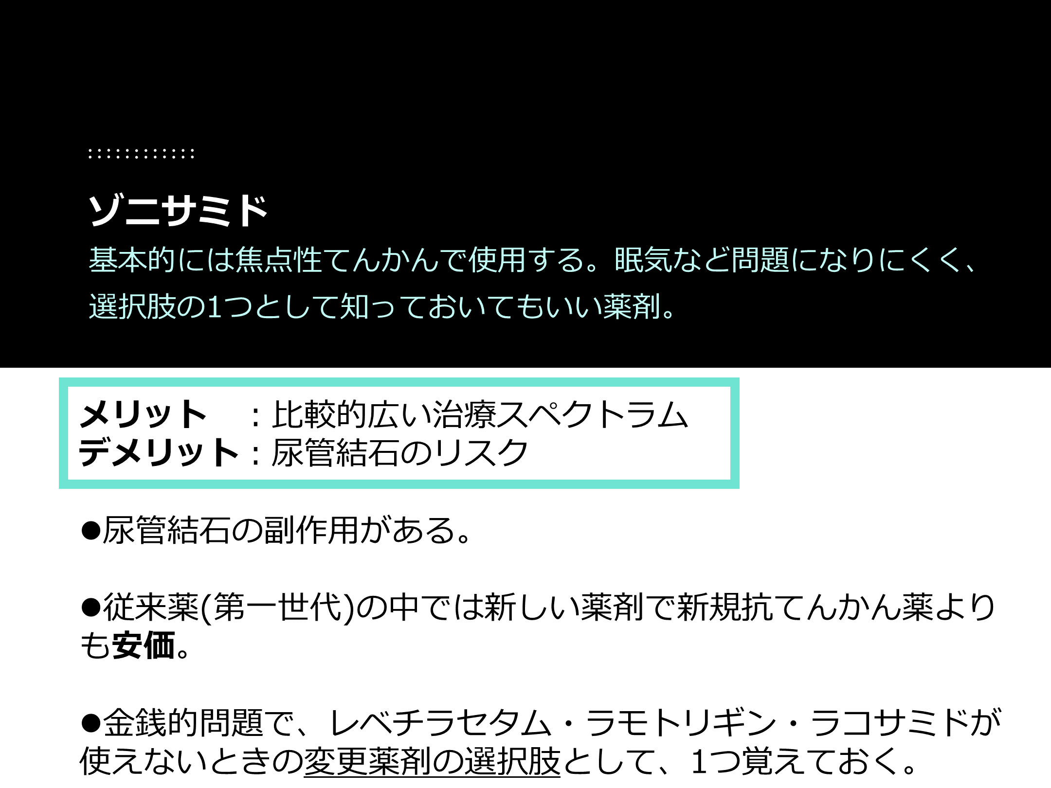 金銭的問題で、レベチラセタム・ラモトリギン・ラコサミドが使えないときの変更薬剤の選択肢として、1つ覚えておく。 ゾニサミド