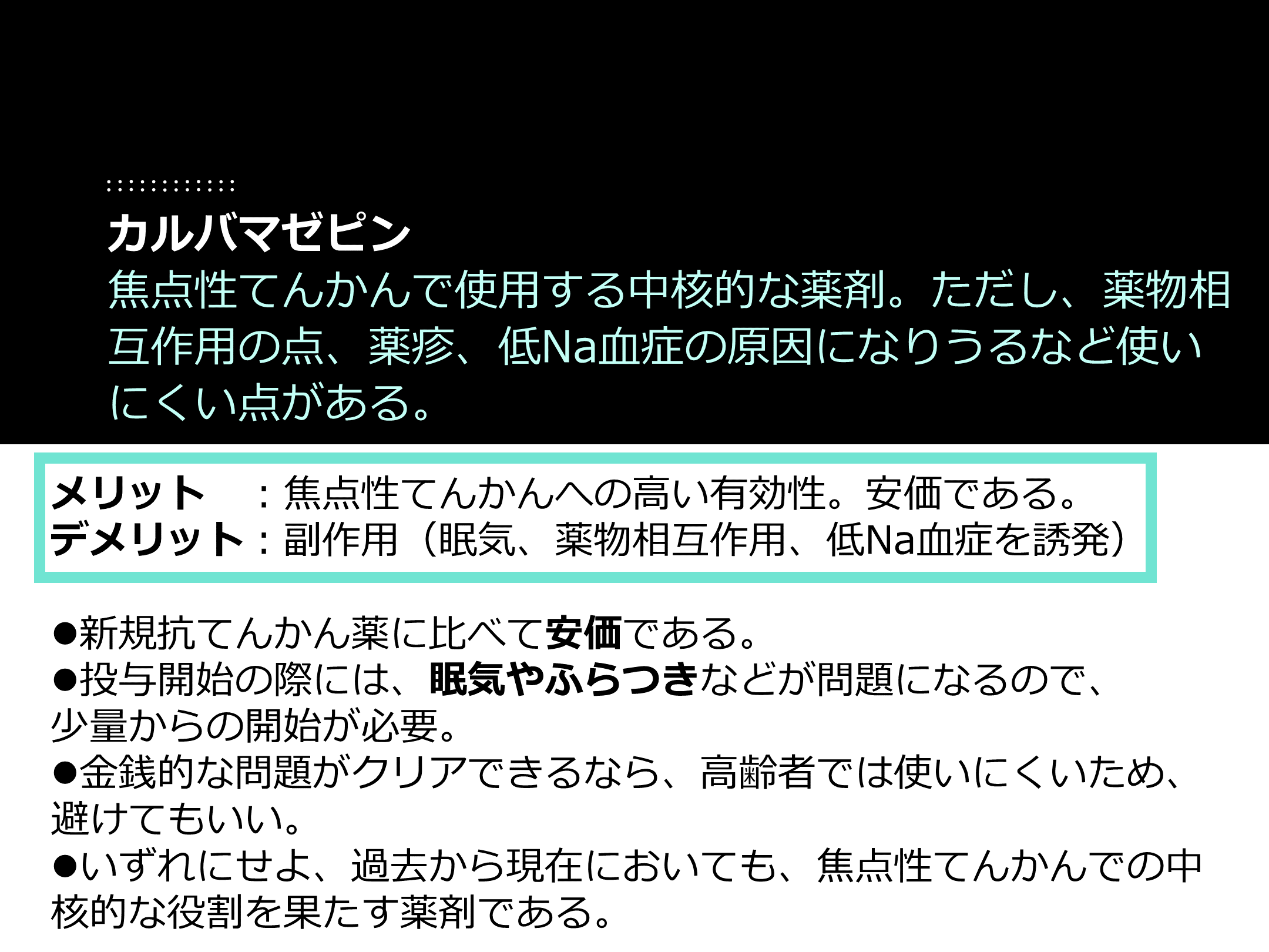 焦点性てんかんで使用する中核的な薬剤。ただし、薬物相互作用の点、薬疹、低Na血症の原因になりうるなど使いにくい点がある。
