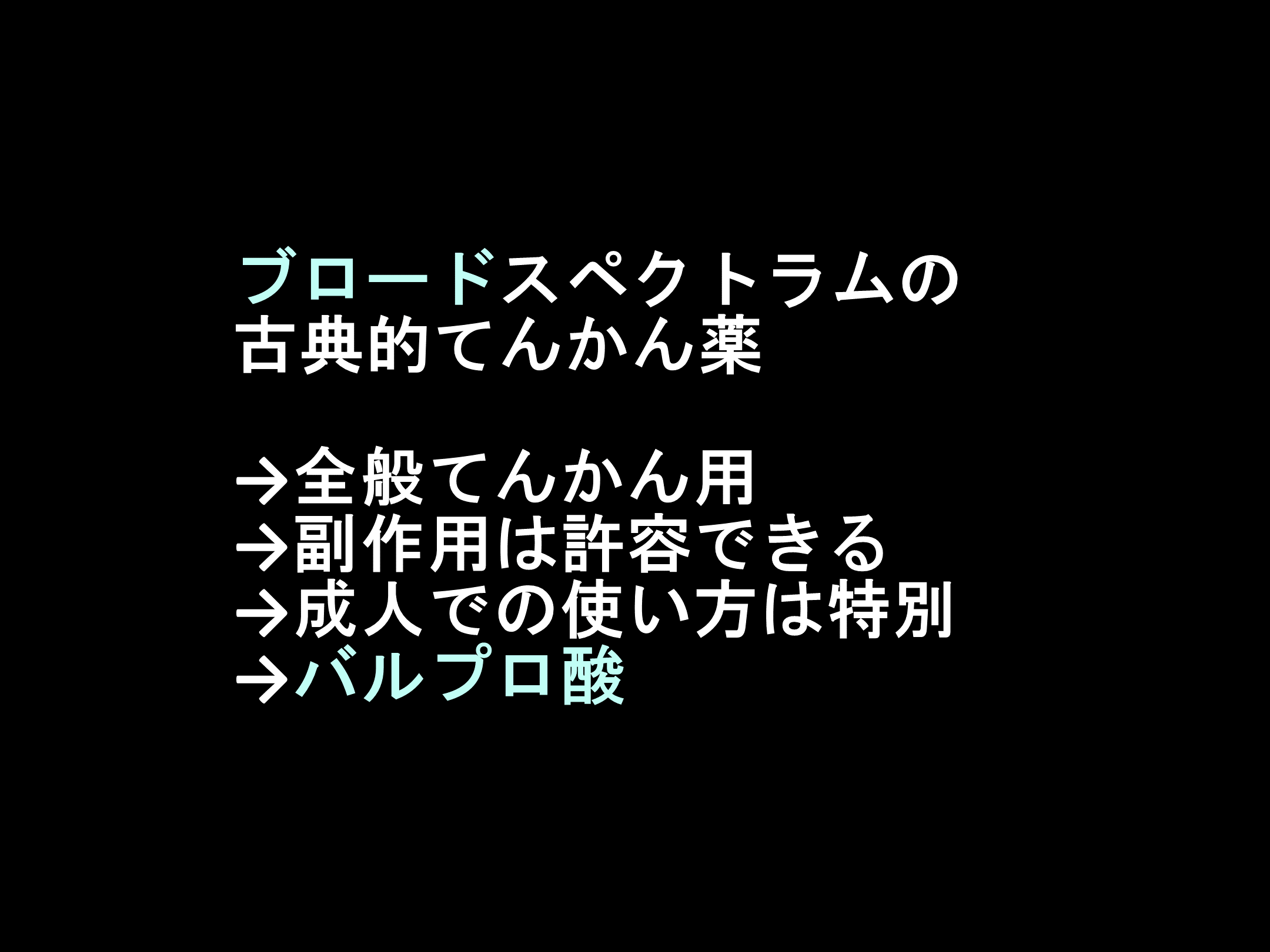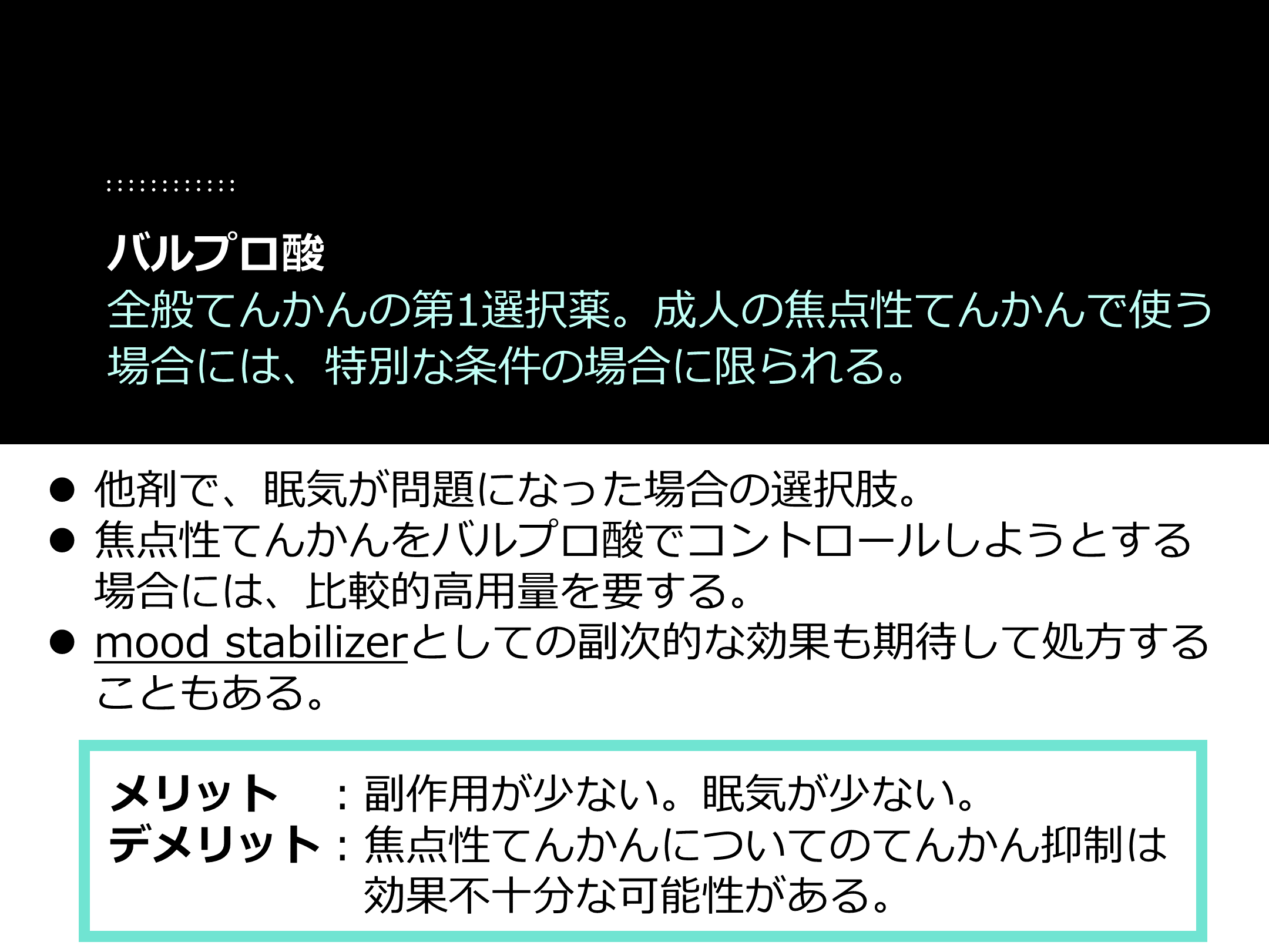 全般てんかんの第1選択薬。成人の焦点性てんかんで使う場合には、特別な条件の場合に限られる。
