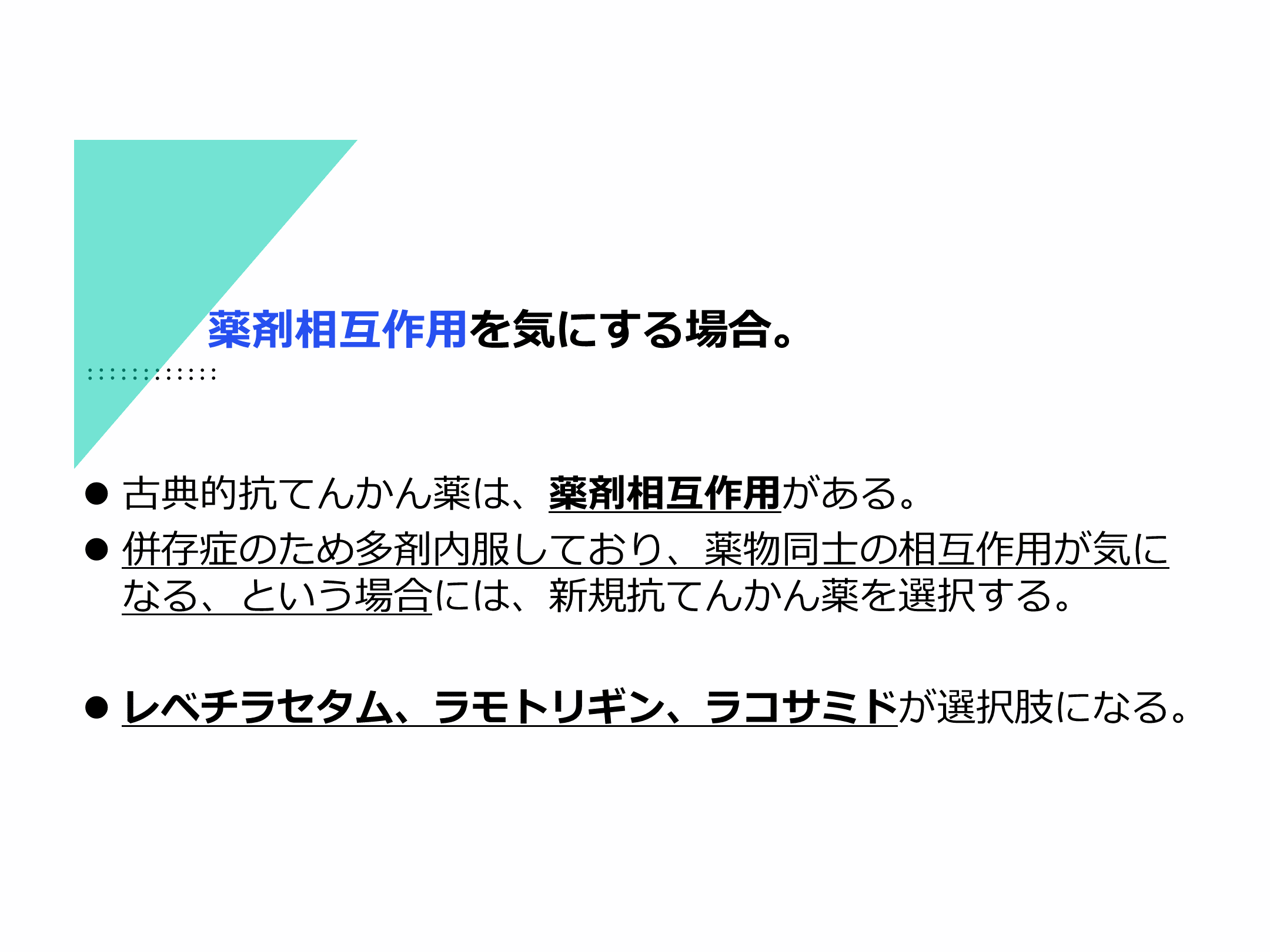 併存症のため多剤内服しており、薬物同士の相互作用が気になる、という場合には、新規抗てんかん薬を選択する。
