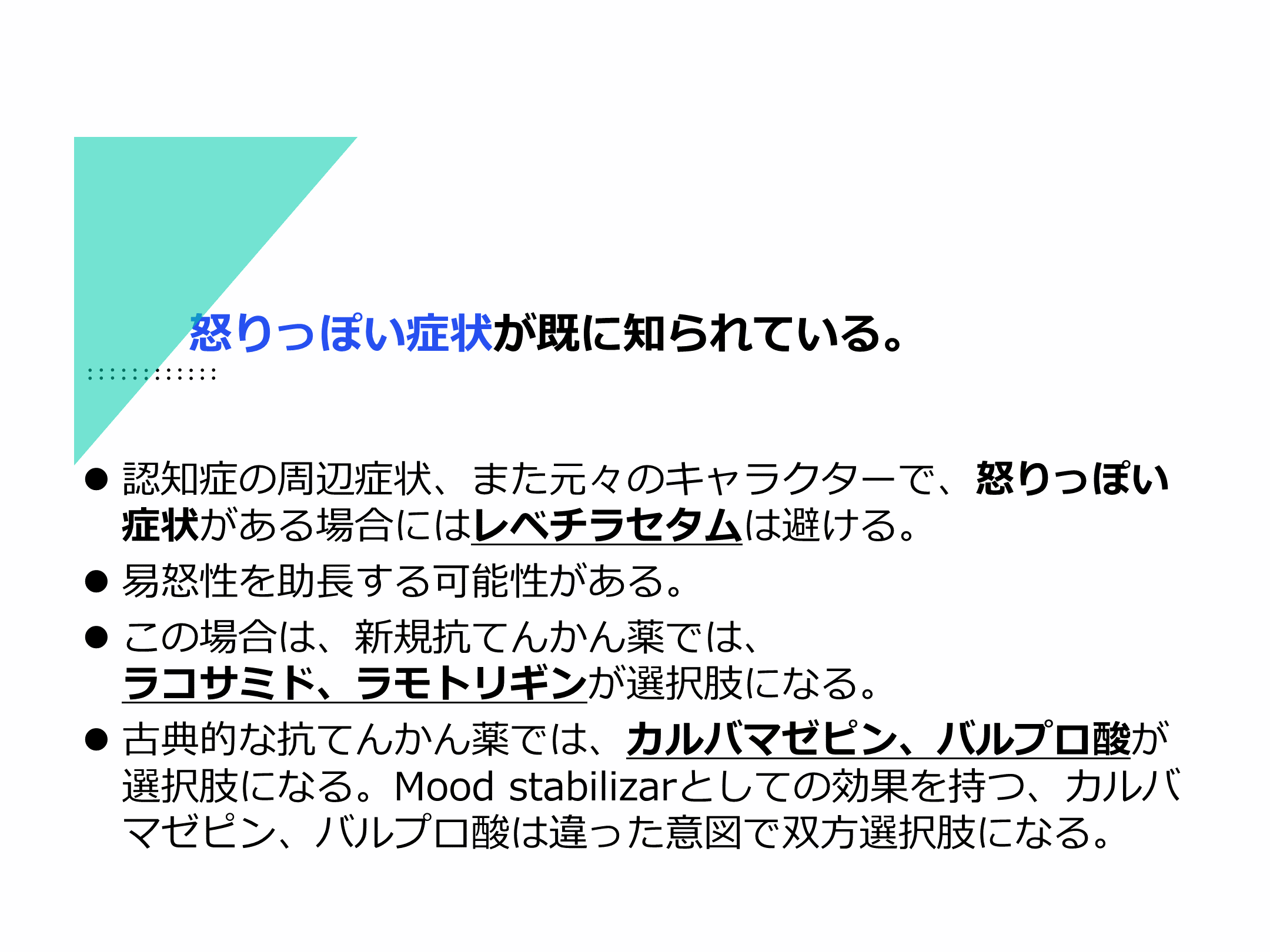 #130. 認知症の周辺症状、また元々のキャラクターで、怒りっぽい症状がある場合にはレベチラセタムは避ける。