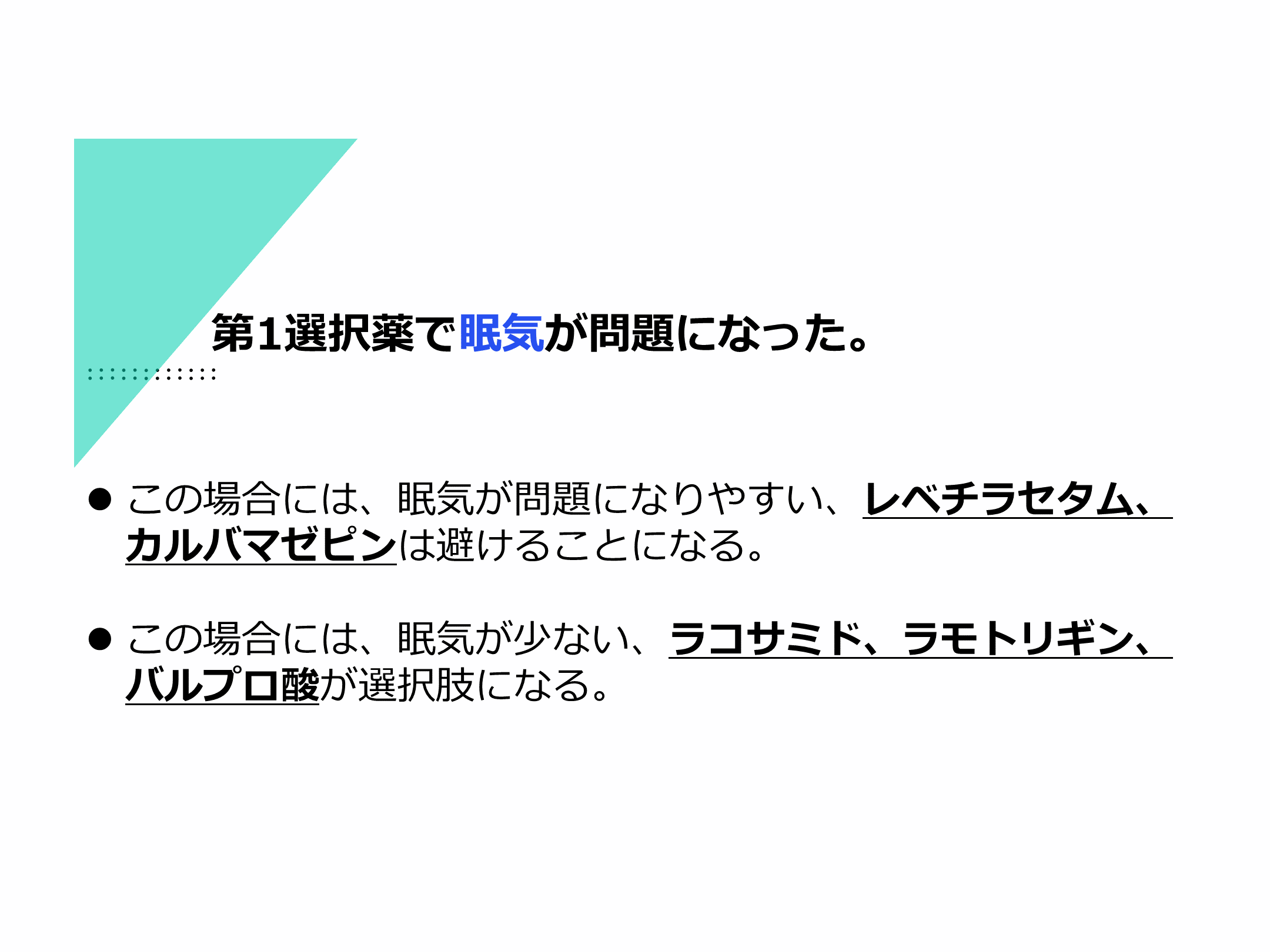 この場合には、眠気が少ない、ラコサミド、ラモトリギン、 バルプロ酸が選択肢になる。 第1選択薬で眠気が問題になった。