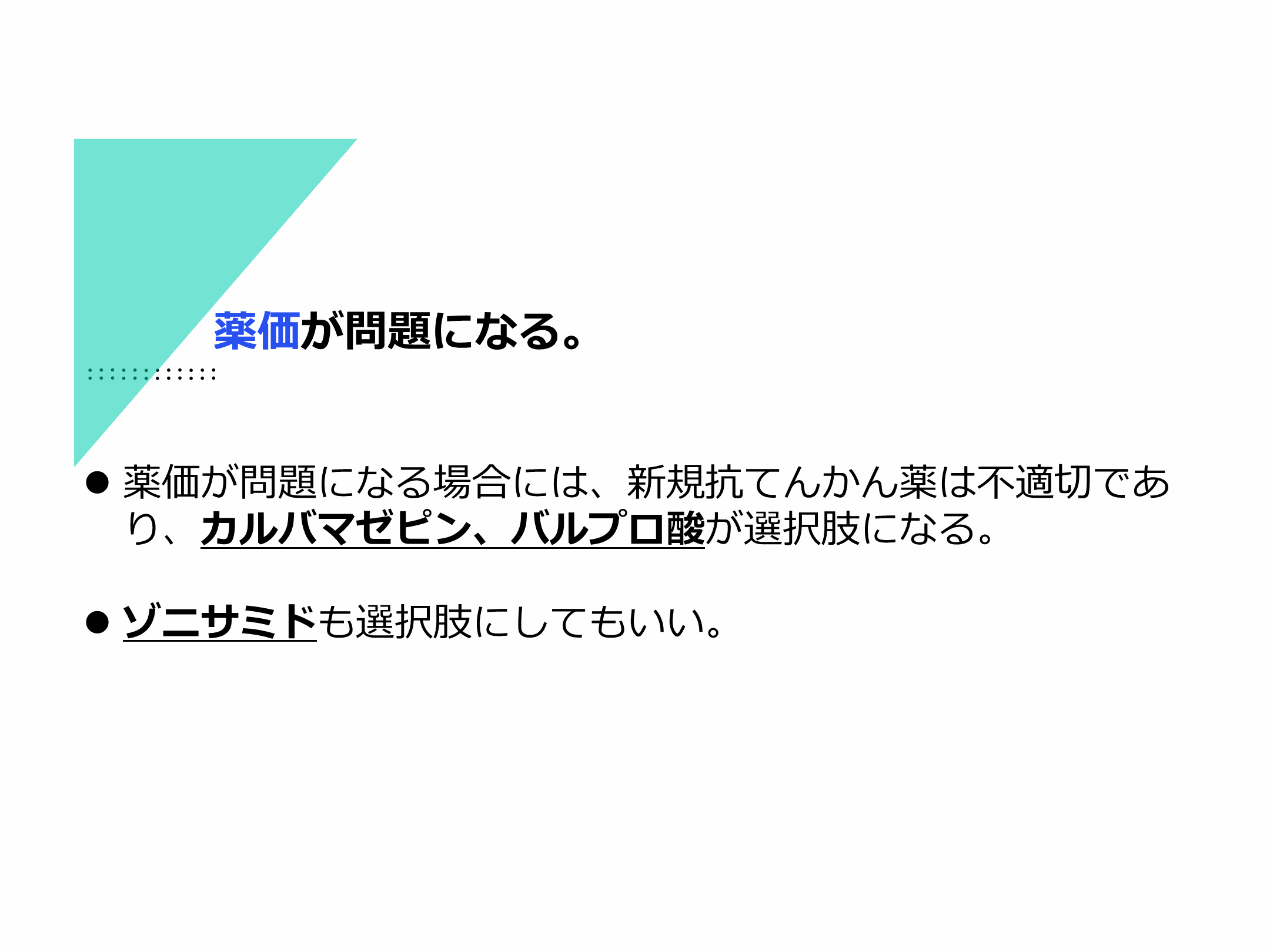 ▲薬価が問題になる。 いずれかの抗てんかん薬を選択する場合には、考慮する条件がある。現実的な診療でよくであるポイントについて解説する。