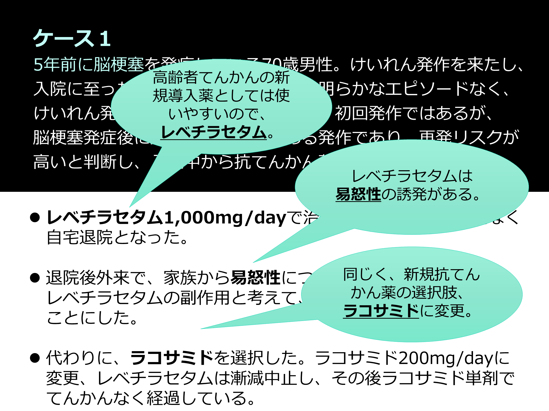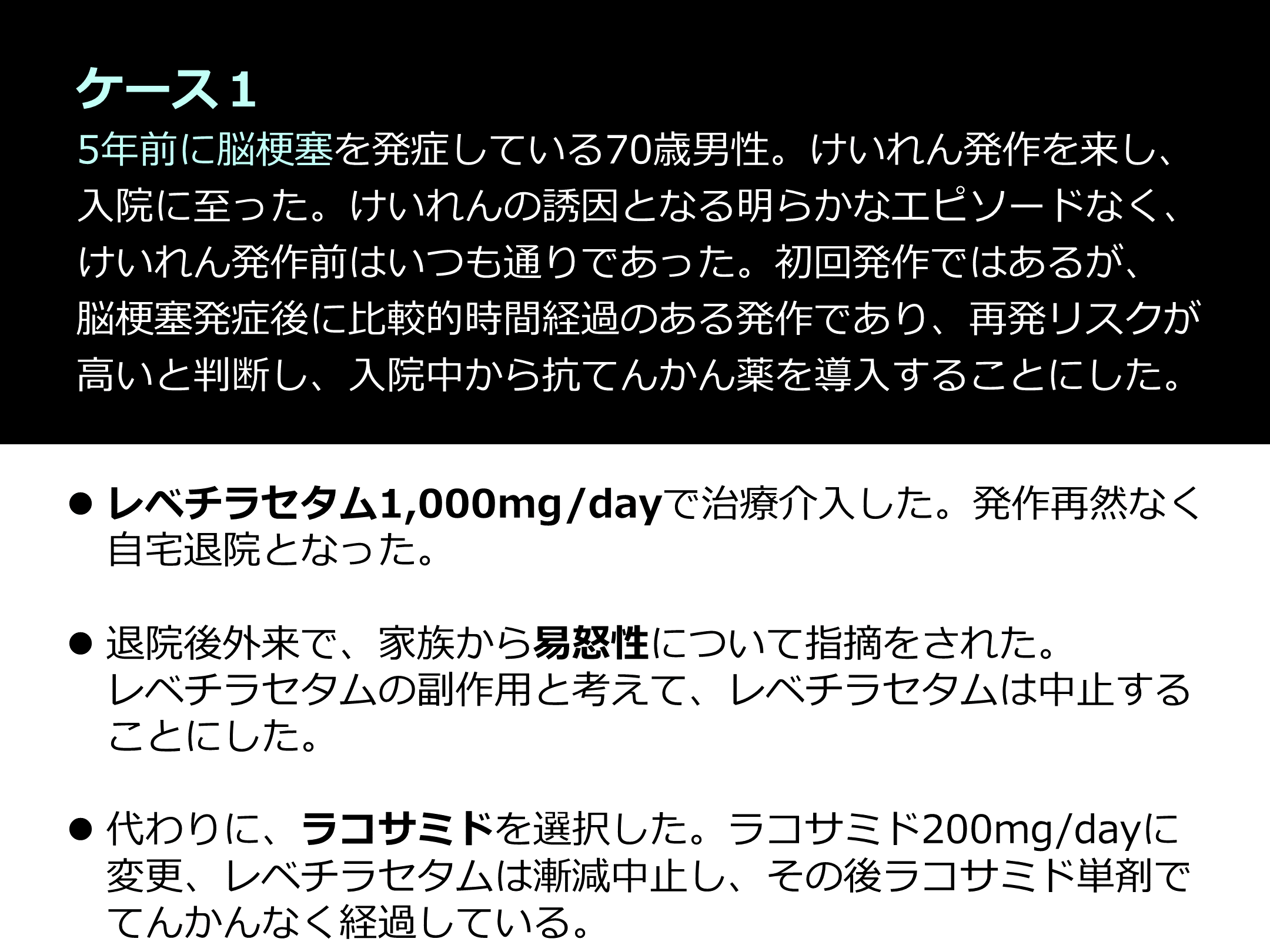 5年前に脳梗塞を発症している70歳男性。けいれん発作を来たし、入院に至った。けいれんの誘因となる明らかなエピソードなく、けいれん発作前はいつも通りであった。初回発作ではあるが、 脳梗塞発症後に比較的時間経過のある発作であり、再発リスクが高いと判断し、入院中から抗てんかん薬を導入することにした。 高齢者てんかんの新規導入薬としては使いやすいので、 レベチラセタム。 レベチラセタムは 易怒性の誘発がある。 同じく、新規抗てんかん薬の選択肢、 ラコサミドに変更。