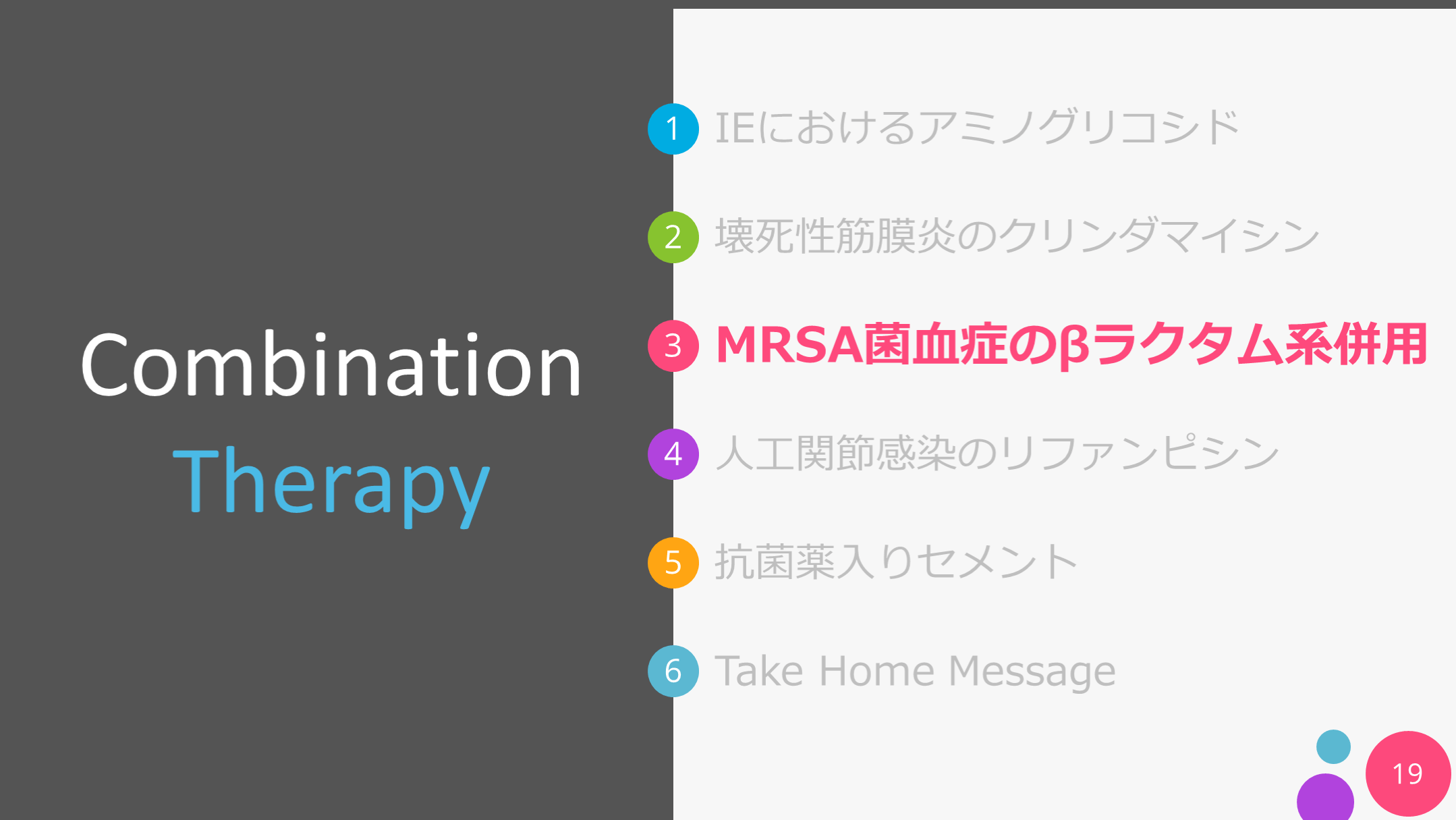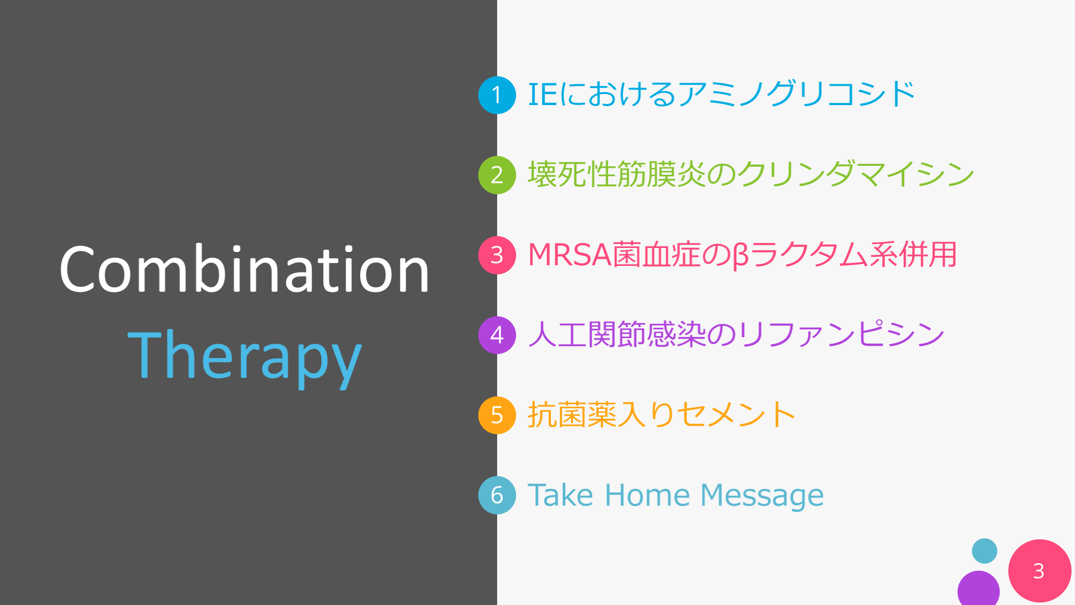 #3. CombinationTherapy IEにおけるアミノグリコシド Take Home Message 壊死性筋膜炎のクリンダマイシン MRSA菌血症のβラクタム系併用 人工関節感染のリファンピシン 抗菌薬入りセメント 3