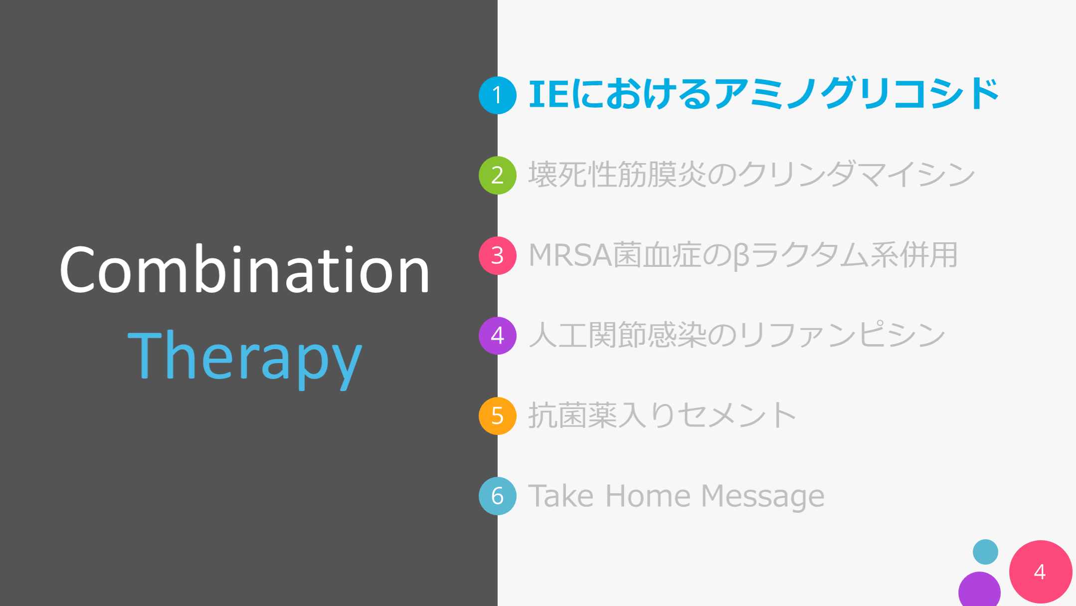 #4. IEにおけるアミノグリコシド Take Home Message 壊死性筋膜炎のクリンダマイシン MRSA菌血症のβラクタム系併用 人工関節感染のリファンピシン 抗菌薬入りセメント 4 CombinationTherapy