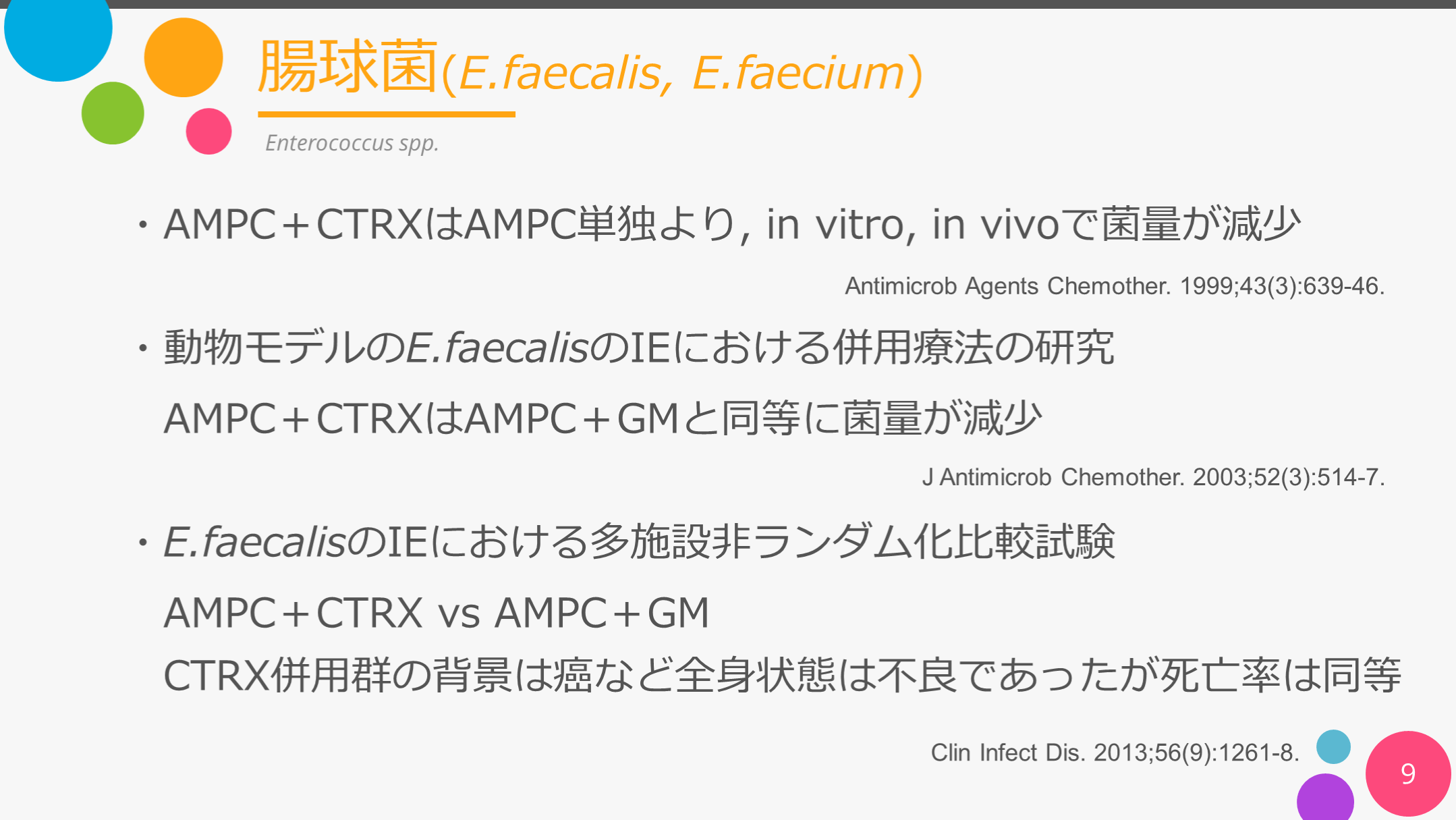 #9. 腸球菌(E.faecalis, E.faecium) 9 Enterococcus spp. ・AMPC+CTRXはAMPC単独より, in vitro, in vivoで菌量が減少