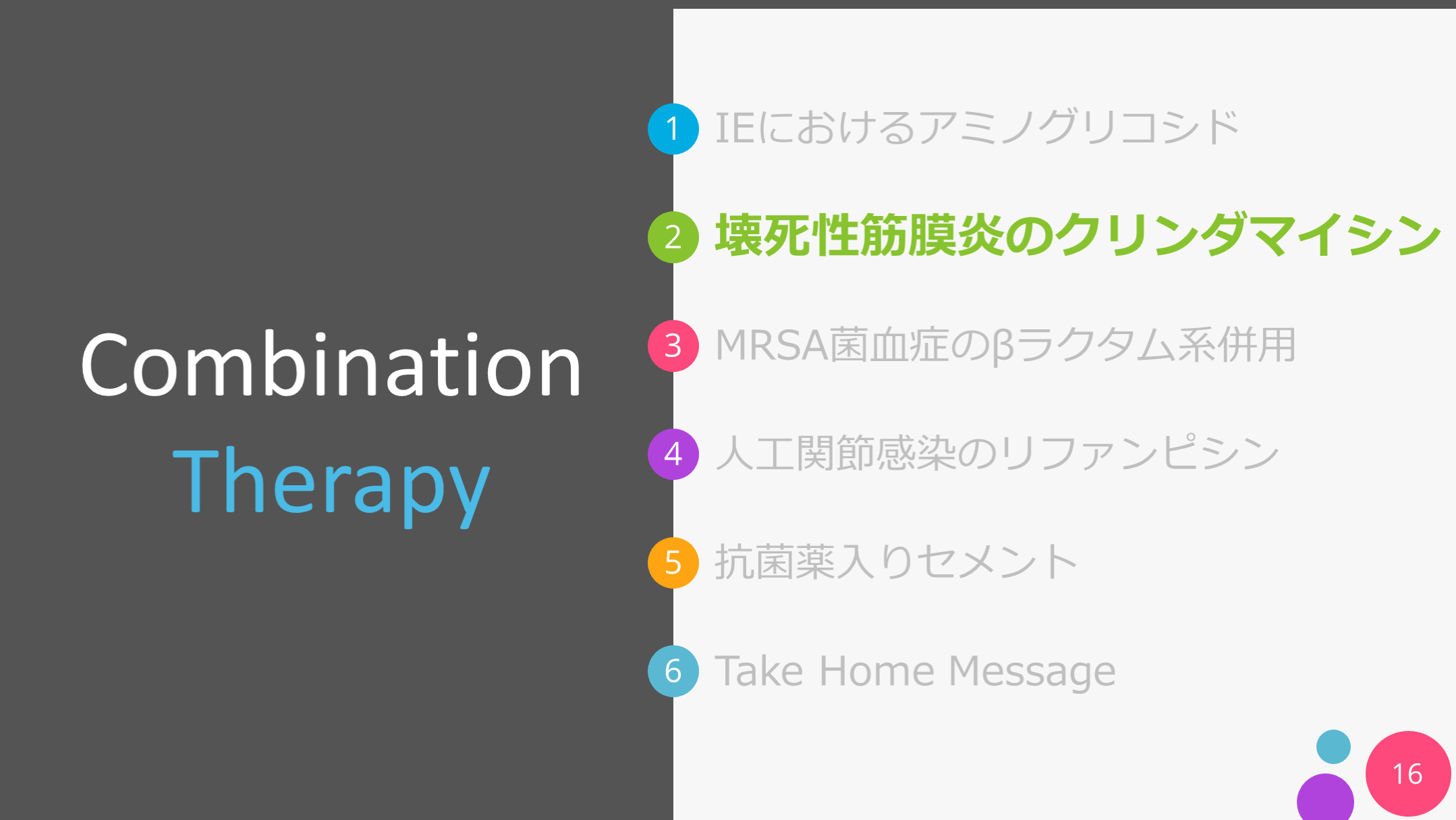 #16. IEにおけるアミノグリコシド Take Home Message 壊死性筋膜炎のクリンダマイシン MRSA菌血症のβラクタム系併用 人工関節感染のリファンピシン 抗菌薬入りセメント 16 CombinationTherapy