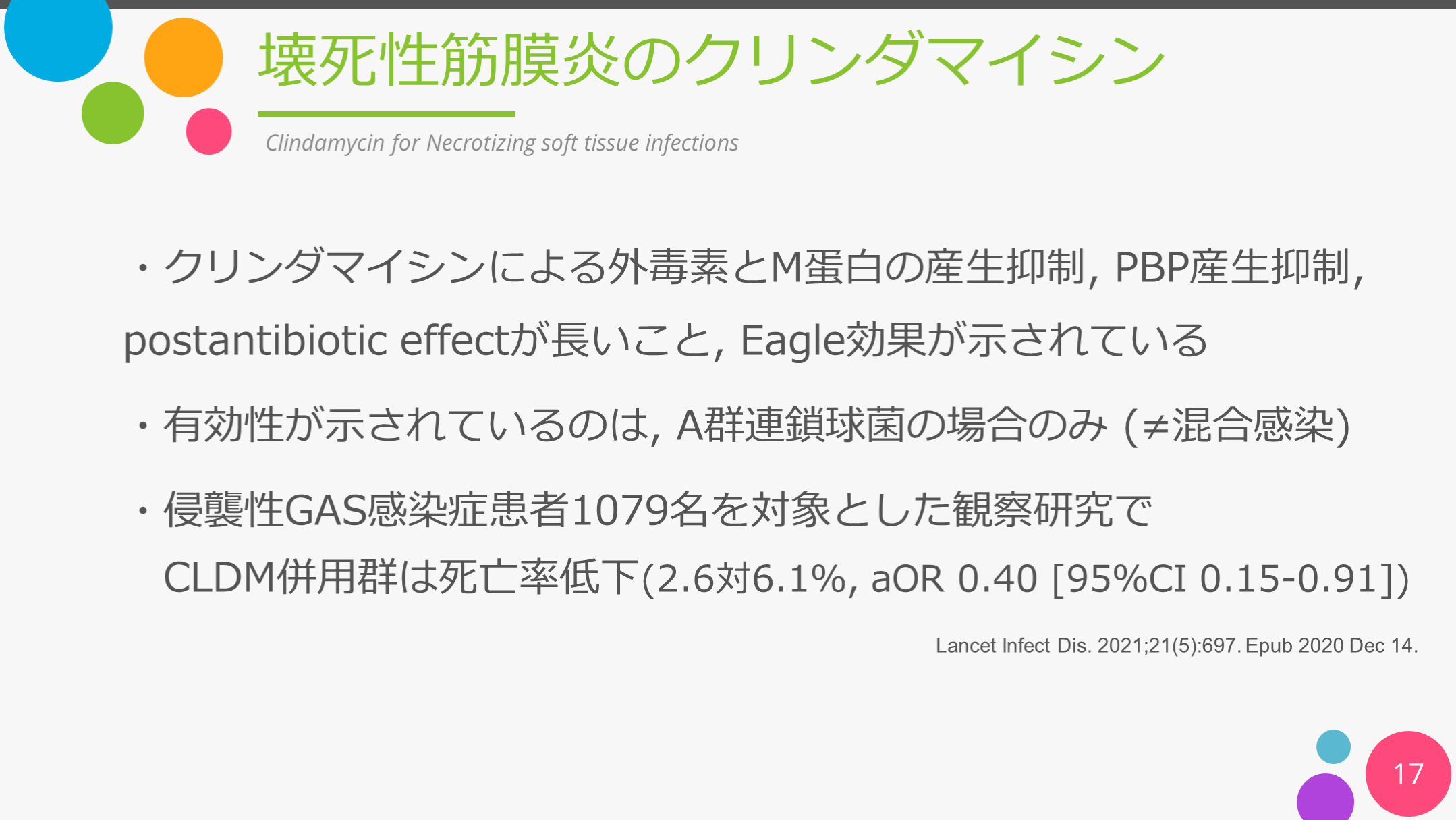 #17. 17 壊死性筋膜炎のクリンダマイシン Clindamycin for Necrotizing soft tissue infections ・クリンダマイシンによる外毒素とM蛋白の産生抑制, PBP産生抑制, postantibiotic effectが長いこと, Eagle効果が示されている