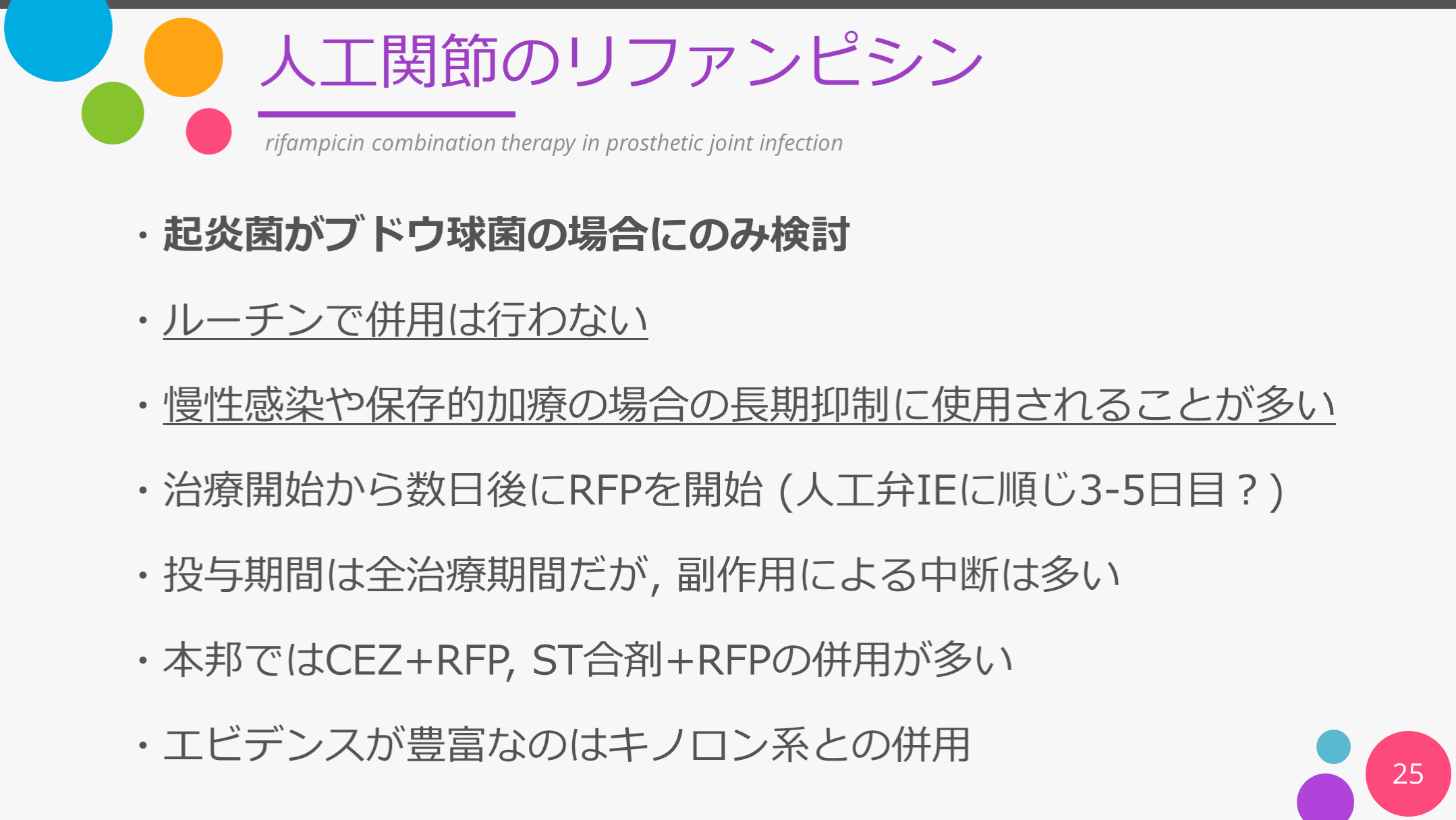 #25. 人工関節のリファンピシン 25 rifampicin combination therapy in prosthetic joint infection ・起炎菌がブドウ球菌の場合にのみ検討