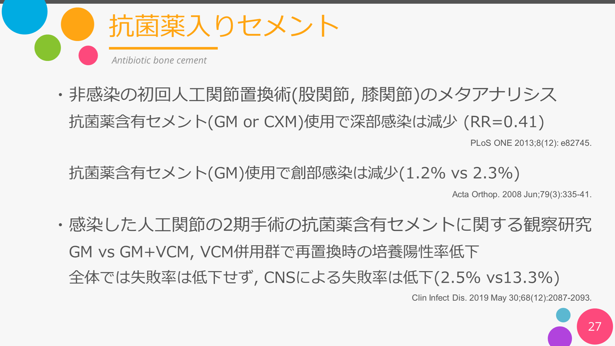#27. 抗菌薬入りセメント 27 Antibiotic bone cement ・非感染の初回人工関節置換術(股関節, 膝関節)のメタアナリシス
