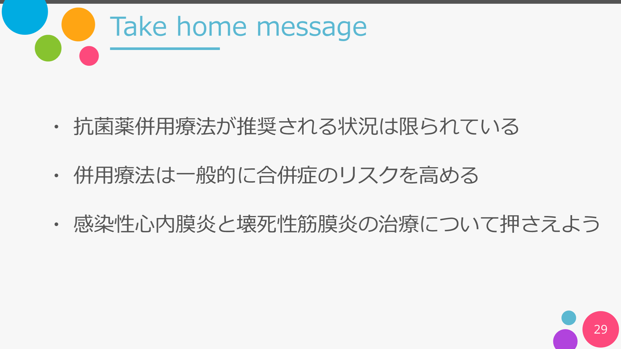 #29. Take home message 29 ・ 抗菌薬併用療法が推奨される状況は限られている