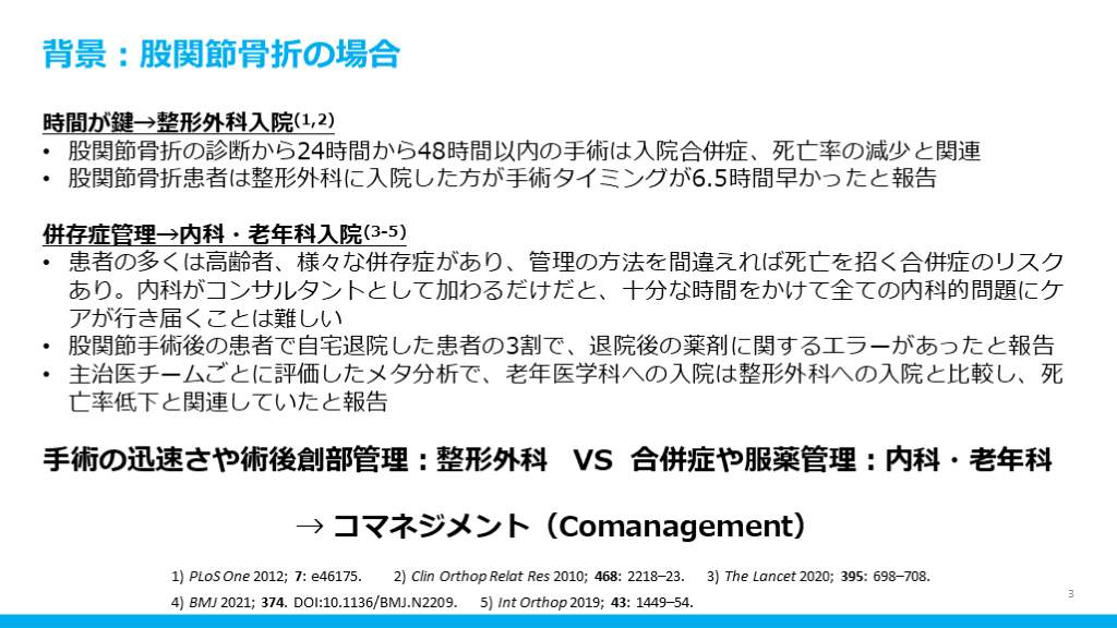 米国で普及し、日本でも実践が始まっているコマネジメントについて、高齢者の大腿骨近位部骨折を主な例として、重要性と実践について解説します。