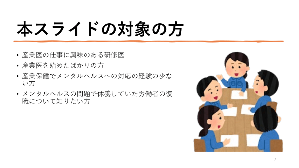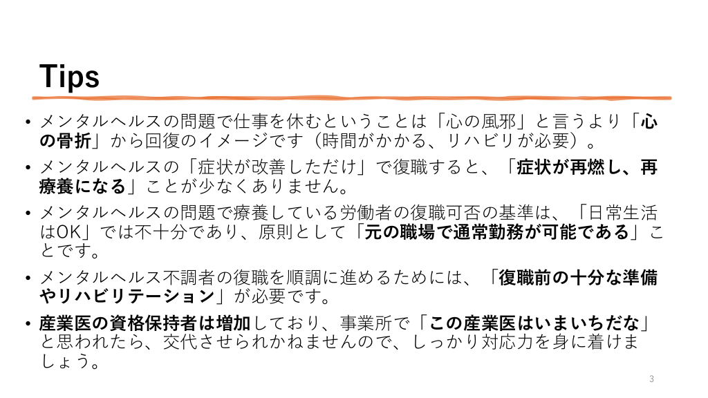 #3. Tips • メンタルヘルスの問題で仕事を休むということは「心の風邪」と言うより「心 の骨折」から回復のイメージです(時間がかかる、リハビリが必要)。 • メンタルヘルスの「症状が改善しただけ」で復職すると、「症状が再燃し、再 療養になる」ことが少なくありません。 • メンタルヘルスの問題で療養している労働者の復職可否の基準は、「日常生活 はOK」では不十分であり、原則として「元の職場で通常勤務が可能である」こ とです。 • メンタルヘルス不調者の復職を順調に進めるためには、「復職前の十分な準備 やリハビリテーション」が必要です。 • 産業医の資格保持者は増加しており、事業所で「この産業医はいまいちだな」 と思われたら、交代させられかねませんので、しっかり対応力を身に着けま しょう。 3