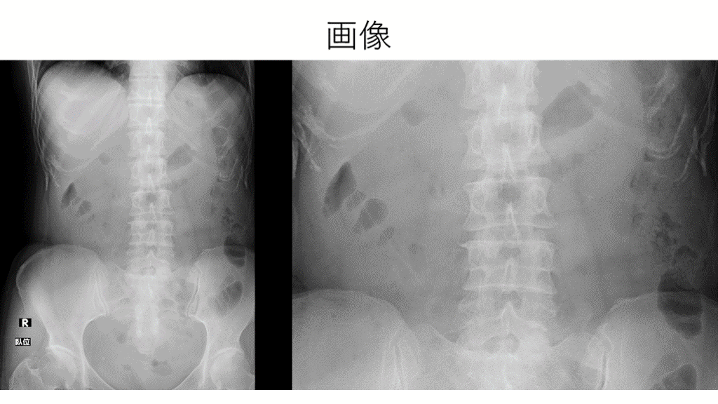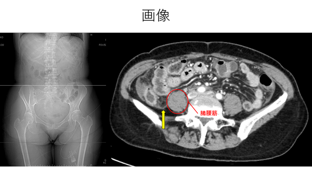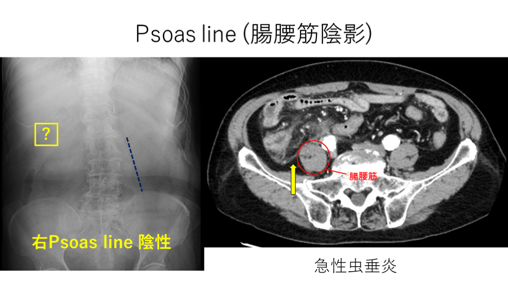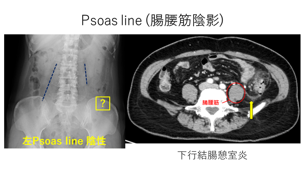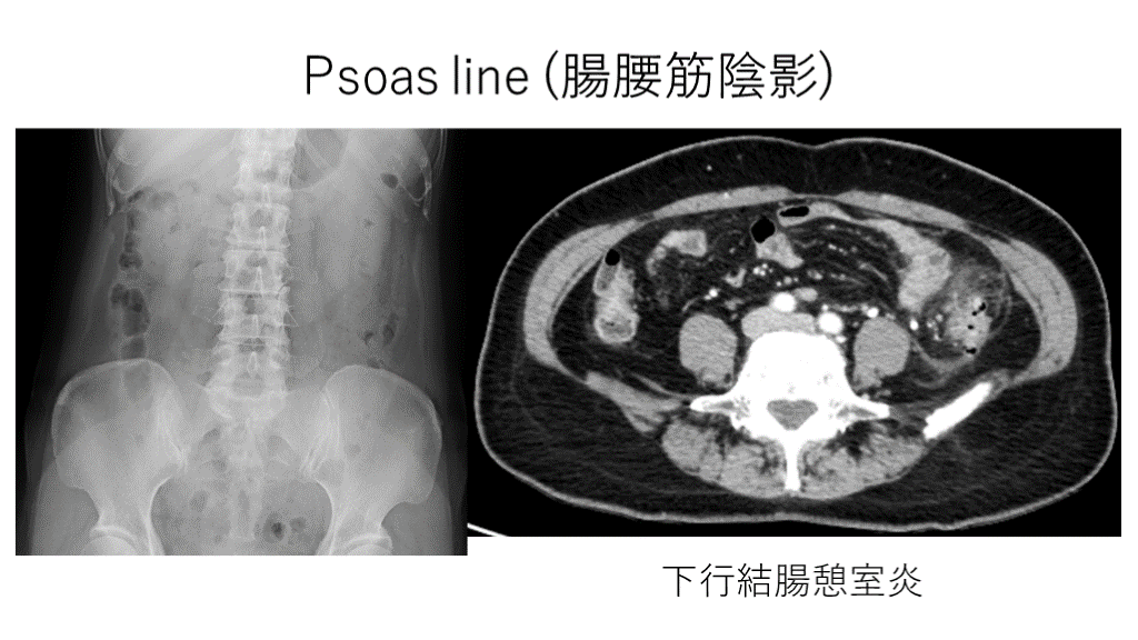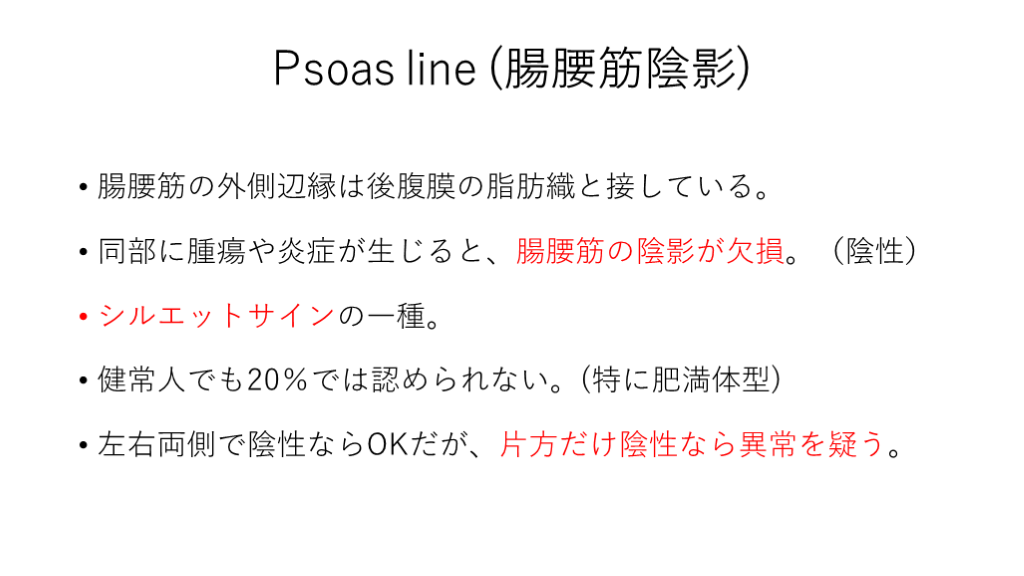 同部に腫瘍や炎症が生じると、腸腰筋の陰影が欠損。(陰性)