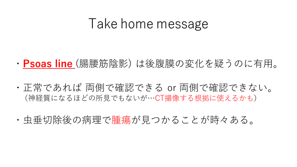 #15. Take home message ・Psoas line (腸腰筋陰影) は後腹膜の変化を疑うのに有用。