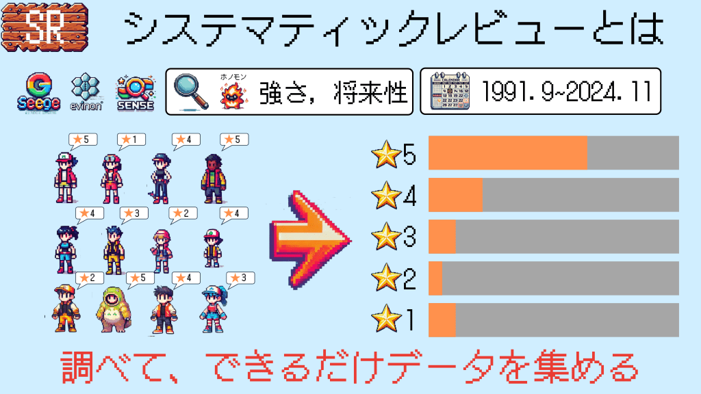 #15. SR システマティックレビューとは ホノモン 5 1 4 5 強さ, 将来性 1991.9~2024.11 5 4 4 3 2 4 3 2 5 4 3 2 1 調べて、できるだけデータを集める