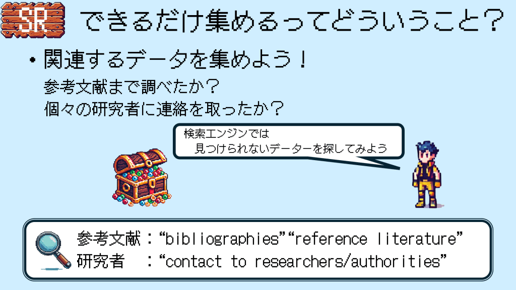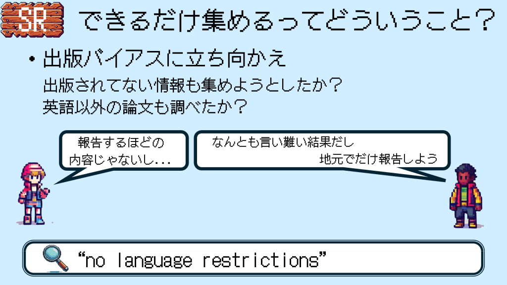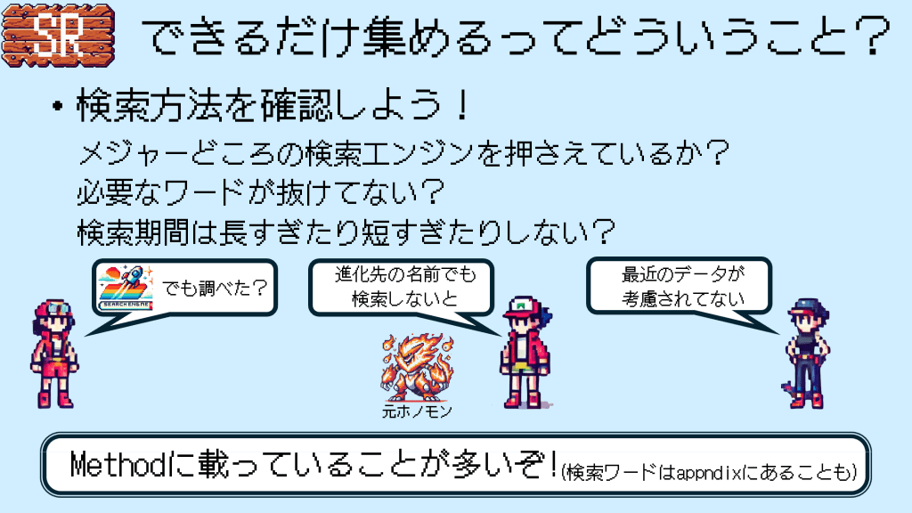 #17. SR できるだけ集めるってどういうこと? ・検索方法を確認しよう! メジャーどころの検索エンジンを押さえているか? 必要なワードが抜けてない? 検索期間は長すぎたり短すぎたりしない? でも調べた? 進化先の名前でも 検索しないと 最近のデータが 考慮されてない 元ホノモン Methodに載っていることが多いぞ!(検索ワードはappndixにあることも)