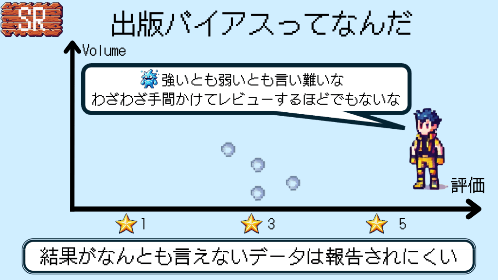 #19. SR 出版バイアスってなんだ Volume 強いとも弱いとも言い難いな わざわざ手間かけてレビューするほどでもないな 評価 1 3 5 結果がなんとも言えないデータは報告されにくい