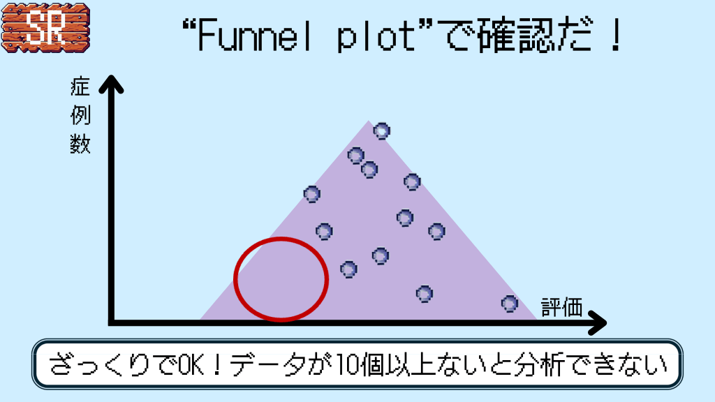 #22. SR “Funnel plot”で確認だ! 症 例 数 評価 ざっくりでOK!データが10個以上ないと分析できない