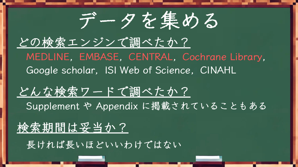 #23. データを集める どの検索エンジンで調べたか? MEDLINE,EMBASE,CENTRAL,Cochrane Library, Google scholar,ISI Web of Science,CINAHL どんな検索ワードで調べたか? Supplement や Appendix に掲載されていることもある 検索期間は妥当か? 長ければ長いほどいいわけではない
